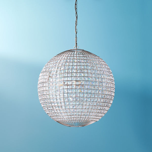 You don't have to live in a nightclub if you hang this Xenon light....but it helps. It is quite exceptional and a serious centrepiece. At sixty centimetres in diameter, with three bulbs, it has literally hundreds of individual glass crystals, all hand tied into place. We chose a nickel finish for the frame...because it makes it look even more insane! We love this.
