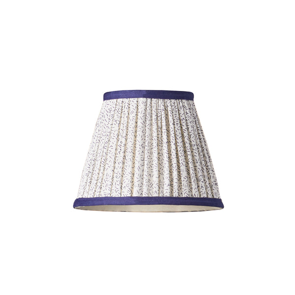 A soft cotton shade block-printed by hand by incredibly skilled craftspeople in a workshop near Jaipur and then pleated and lined – a stone base cloth with lots of little blue dash doodles and finished with matching blue tape.
