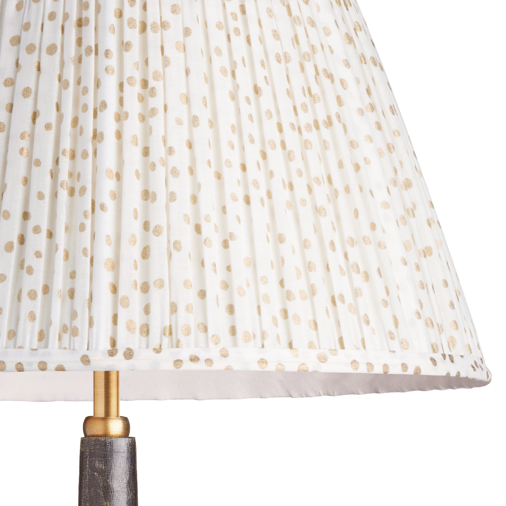A soft cotton shade block-printed by hand by incredibly skilled craftspeople in a workshop near Jaipur and then pleated and lined. Little spots of gold colour.