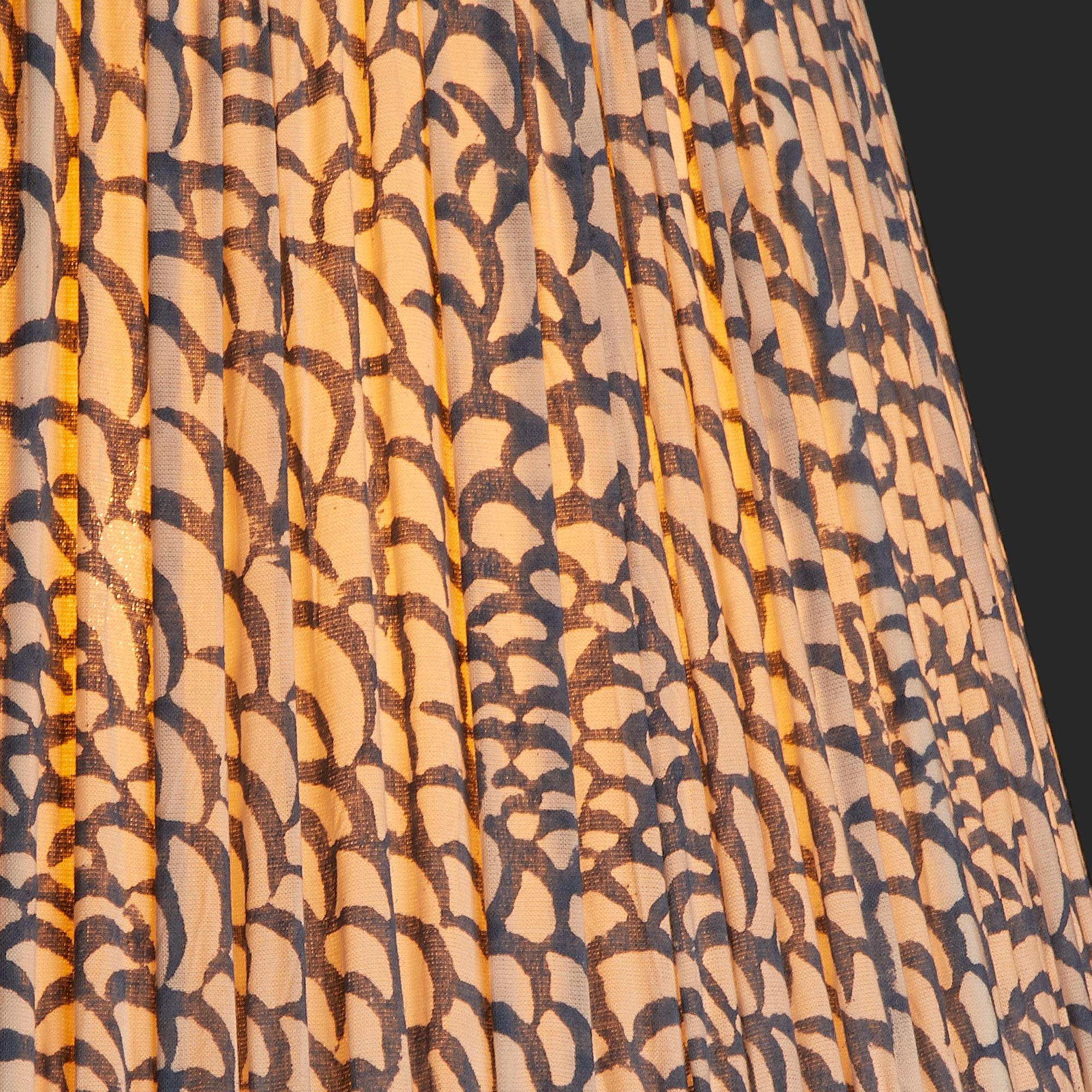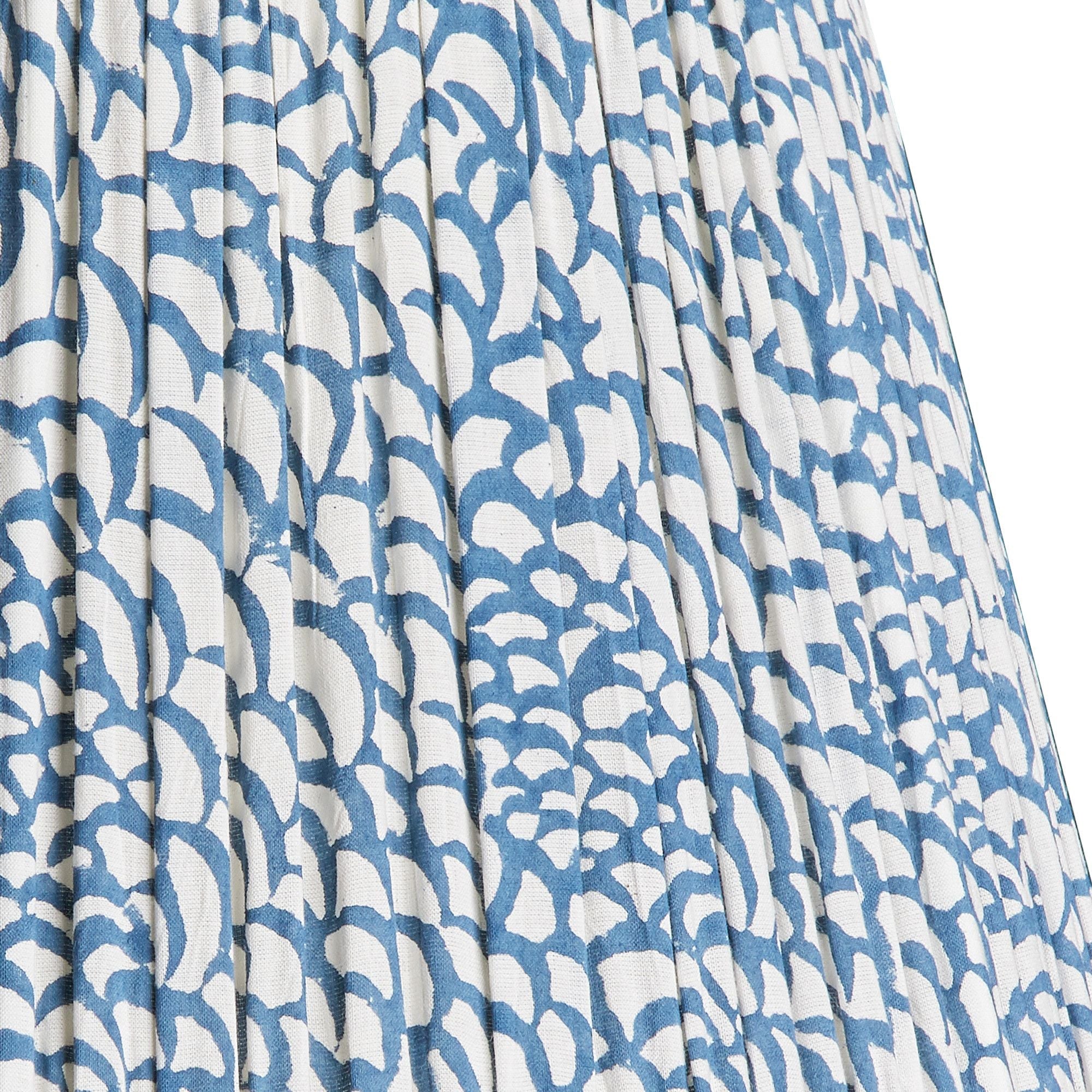 A soft cotton shade block-printed by hand by incredibly skilled craftspeople in a workshop near Jaipur and then pleated and lined. Taped top and bottom and with a pretty fish-scale pattern.