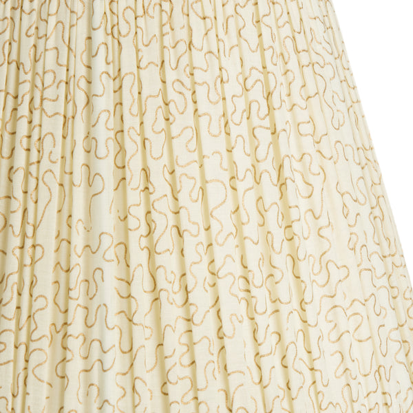 A soft cotton shade block-printed by hand by incredibly skilled craftspeople in a workshop near Jaipur. With a beautiful golden shimmer to the squiggle pattern.
