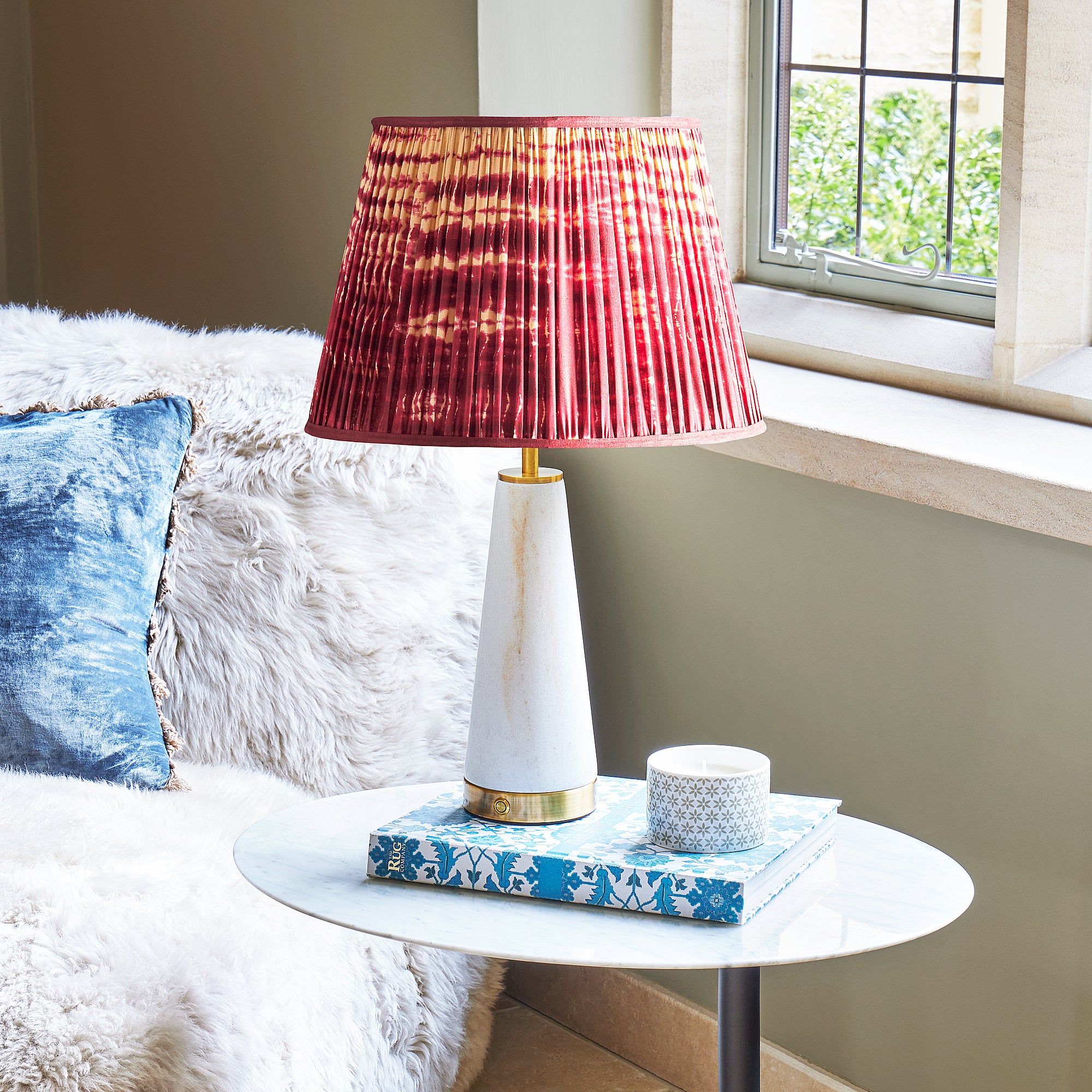 The tie dye style has been cheapened a little over the years, but when used properly it is insanely smart and stylish. This strong Crimson and the flowing pattern work just beautifully as a shade.
