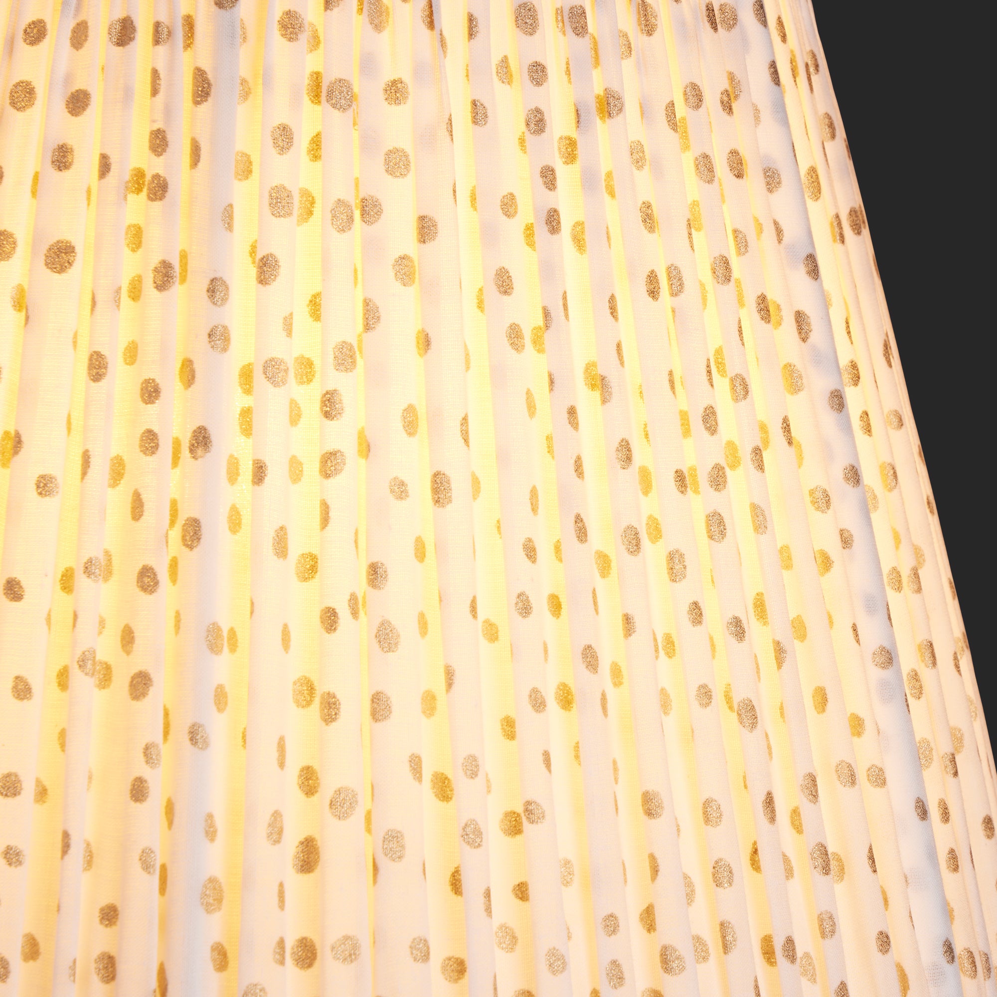 A soft cotton shade block-printed by hand by incredibly skilled craftspeople in a workshop near Jaipur and then pleated and lined. Little spots of gold colour.