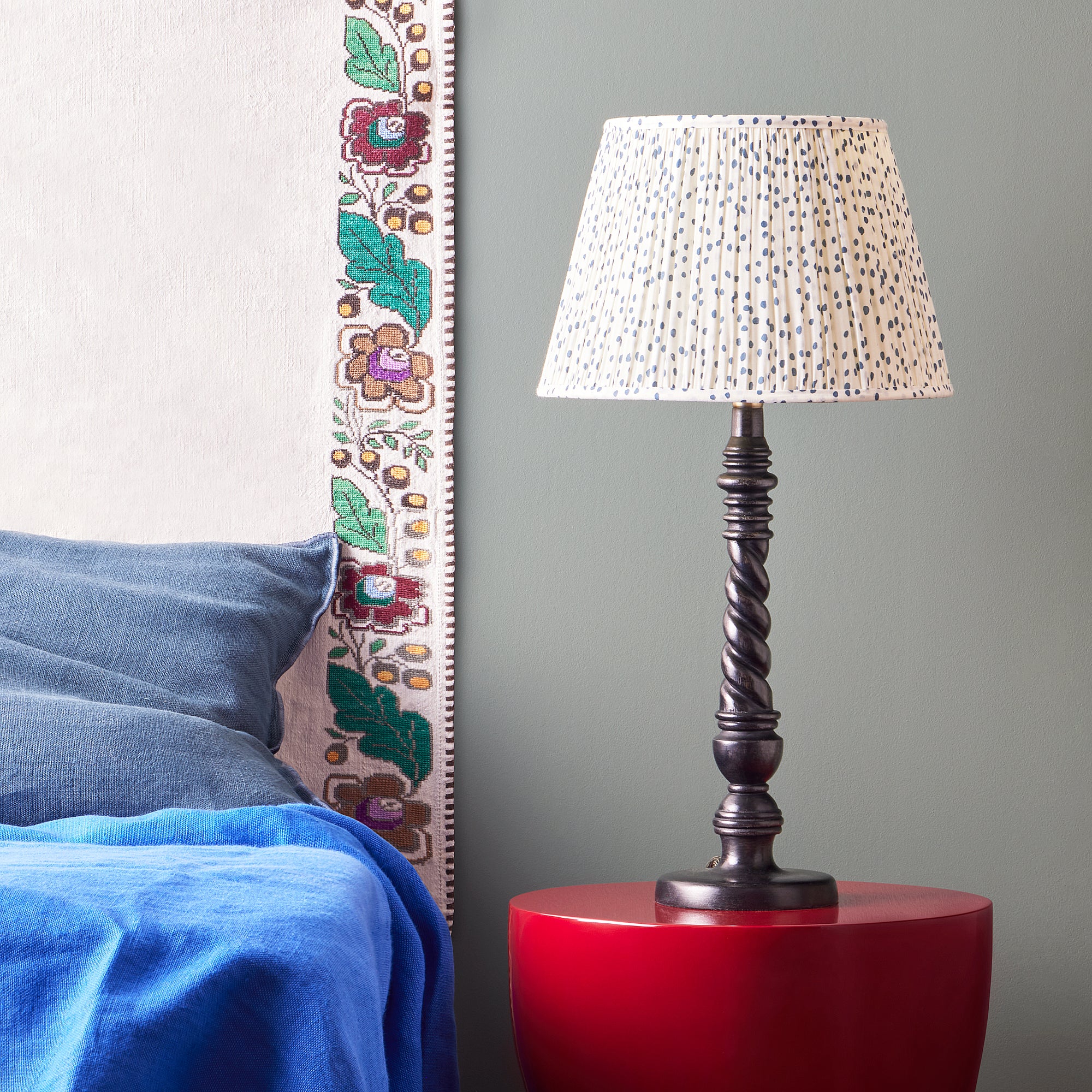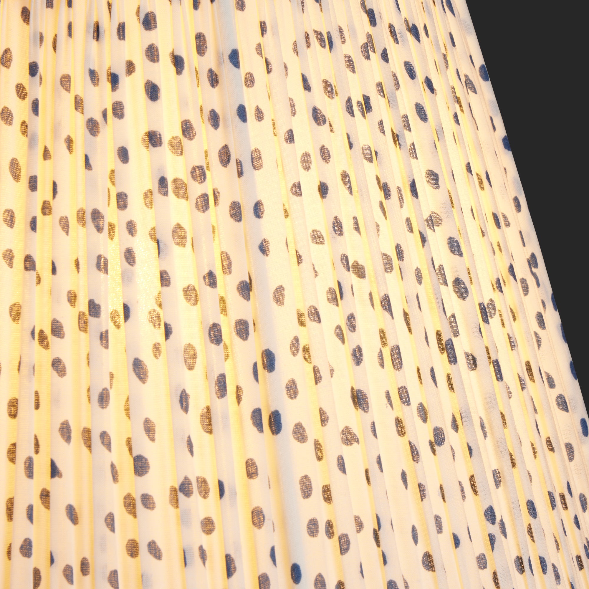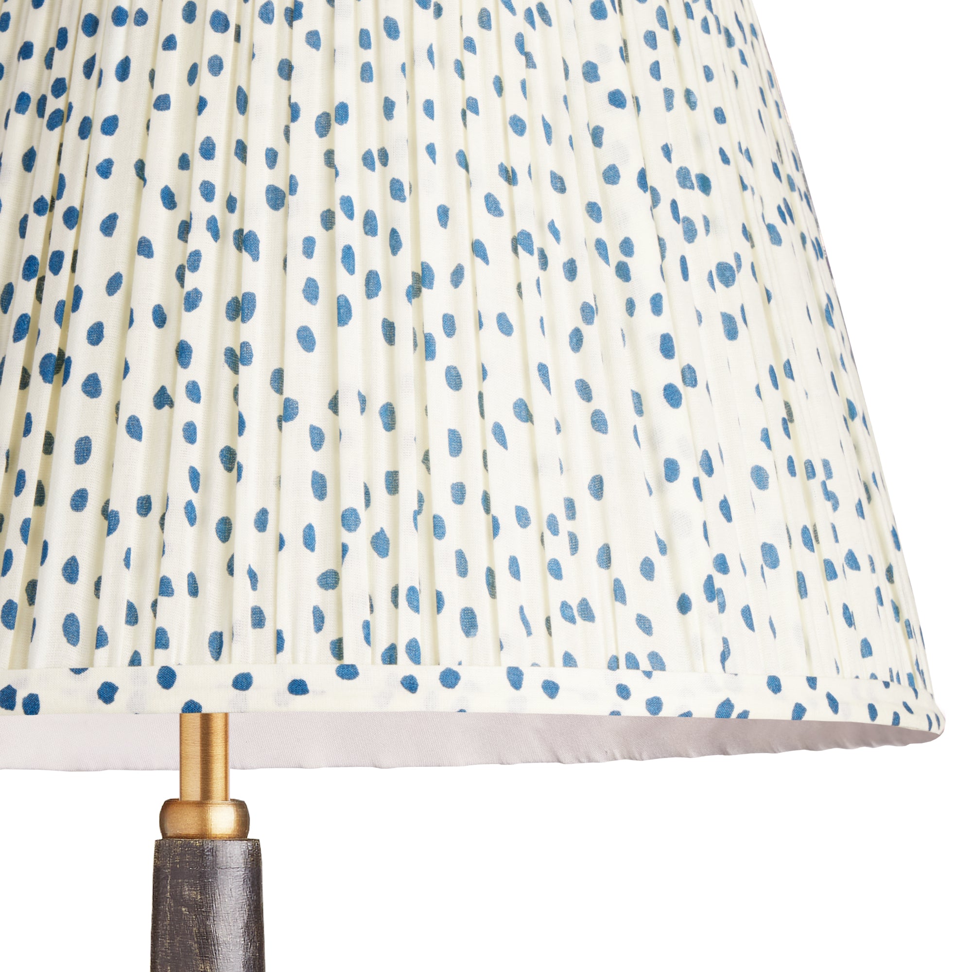 A soft cotton shade block-printed by hand by incredibly skilled craftspeople in a workshop near Jaipur and then pleated and lined - with little spots of blue.