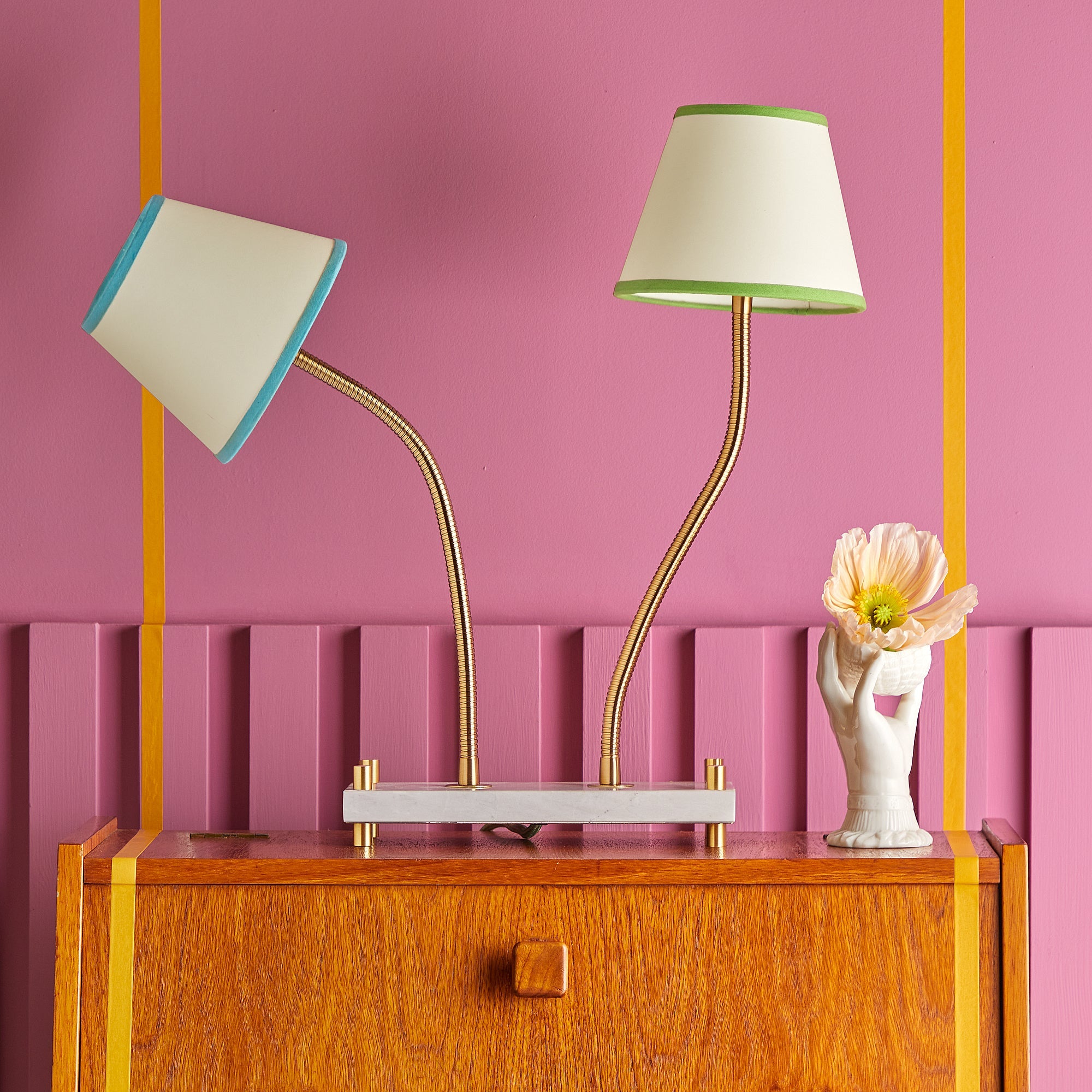 If you wanted to go out looking sharp, you might ease into a white suit and spice it up with matching hat and shoes. Well why should a lampshade be any different? Very striking just off white card, lined with cotton and topped and tailed with a jolt of colour. Natty!