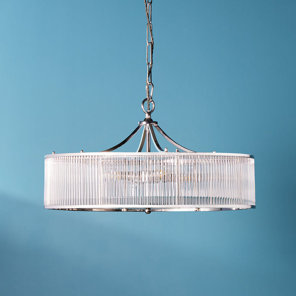 A marvel of glass roddery! We proportioned the Athena to project all the glamour of a chandelier vibe in a smaller space. Lots of sparkle through the solid glass rods and a baffle to diffuse the light downwards. All contained in a solid brass frame. Altogether, thoroughly glamorous! Seen here in a nickel finish and comes with a certain level of self-assembly required.