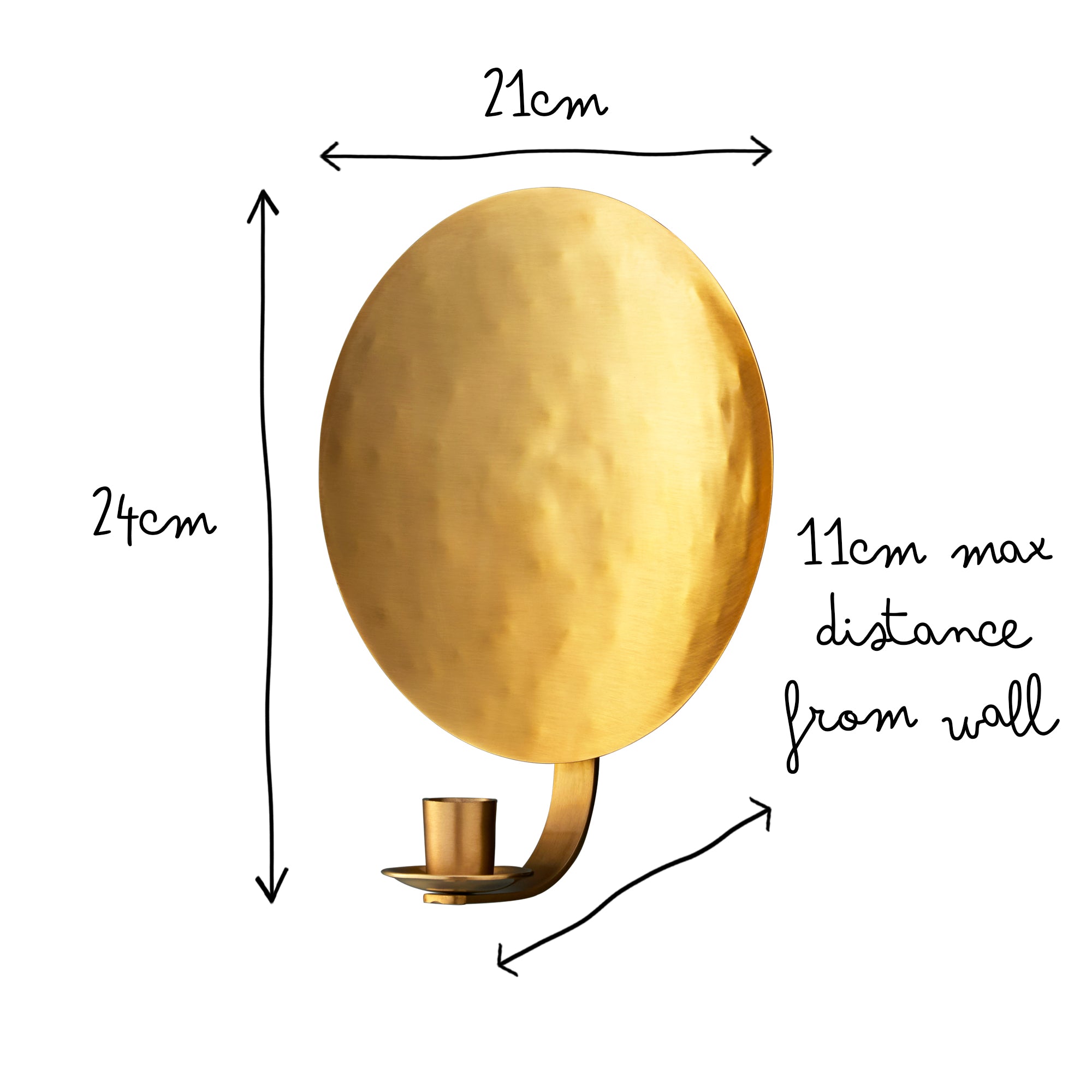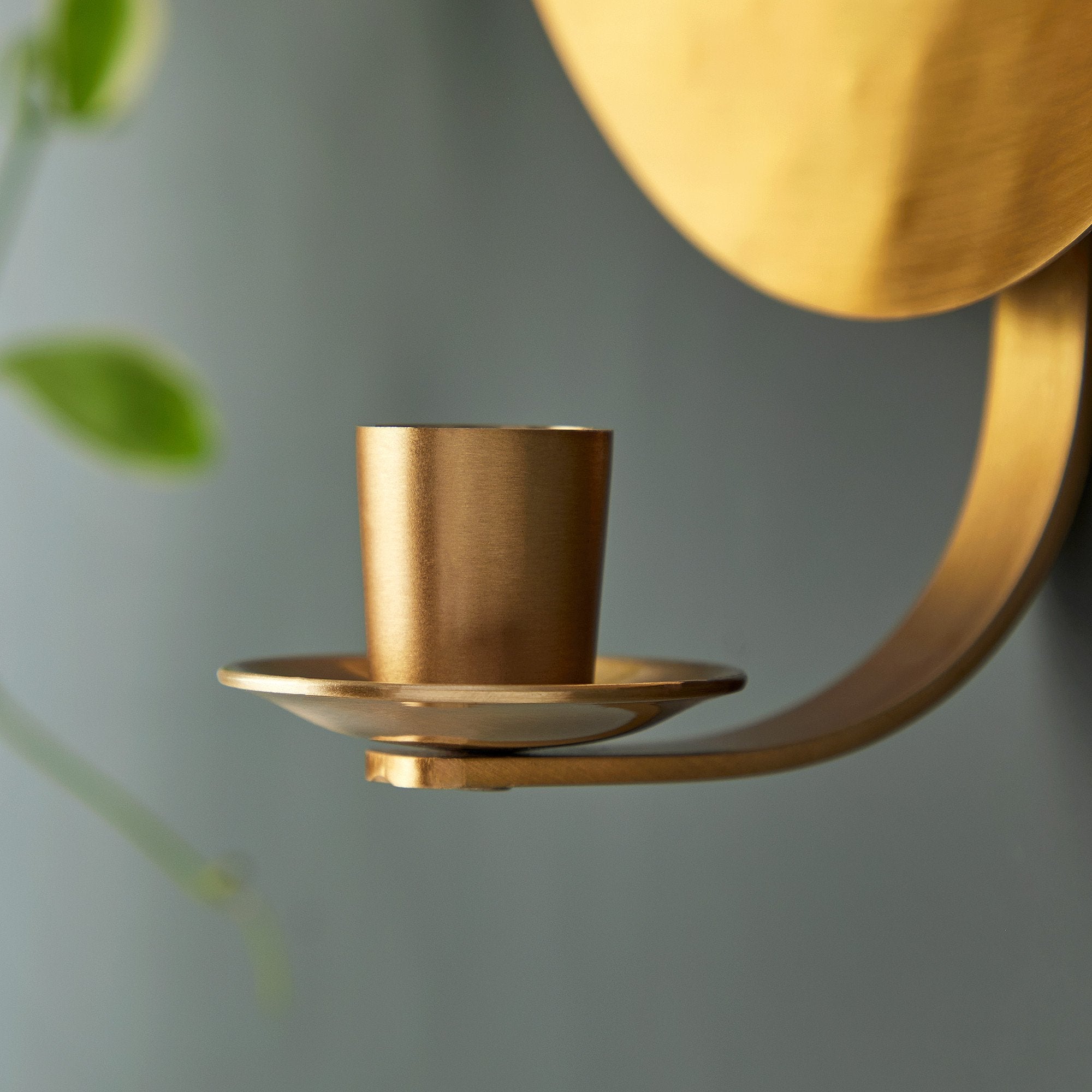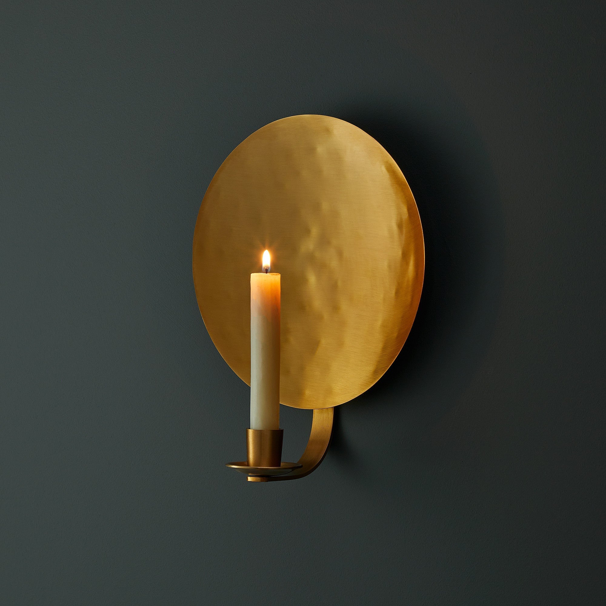 Sometimes the simple things are the best. No frills, nothing fancy, but beautifully made and elegantly finished. Our Celeste wall mounted candle holder is a concave moon of lightly hammered brass with a subtle antiqued finish...with or without a candle it’ll lift the spirit (as opposed to summon the spirits...).