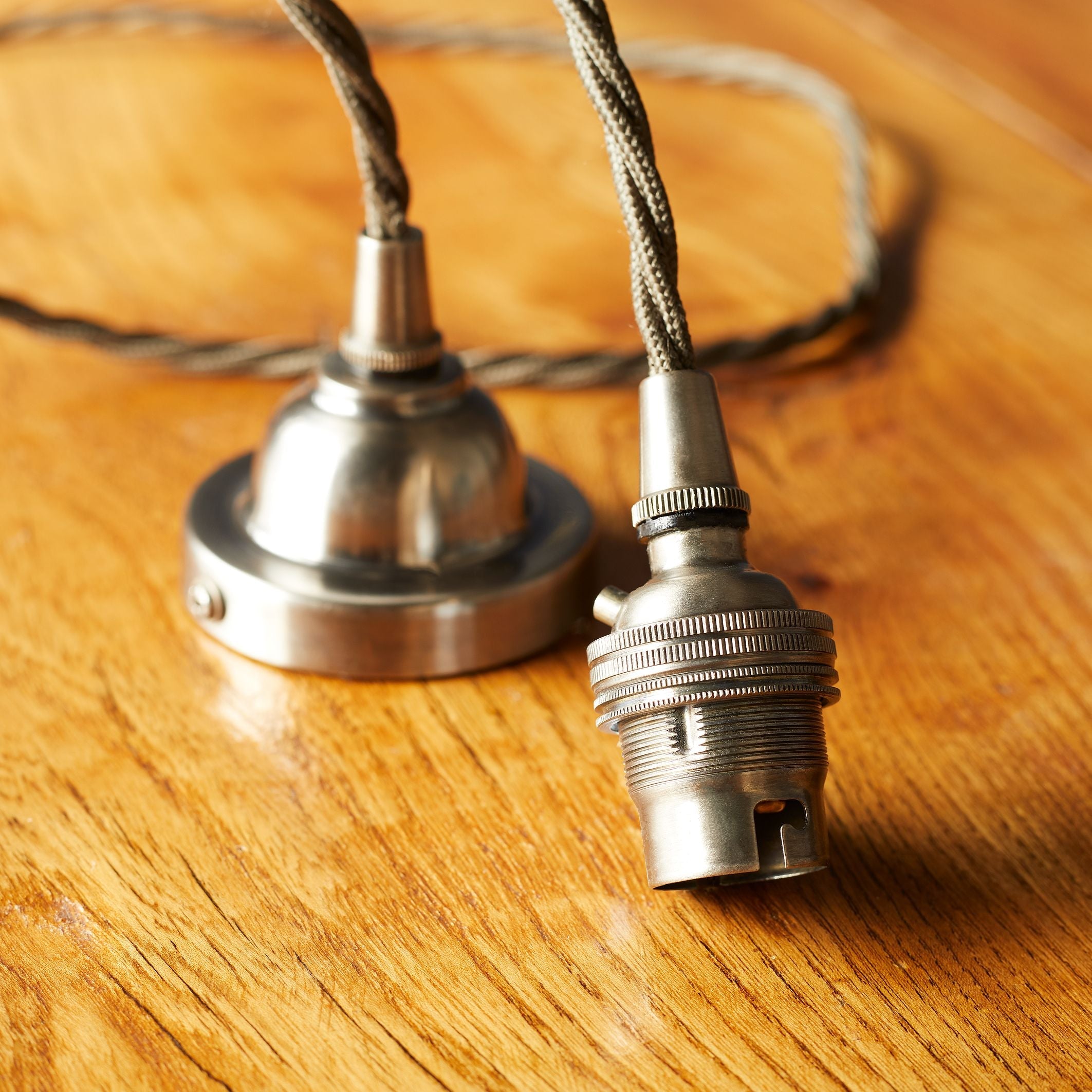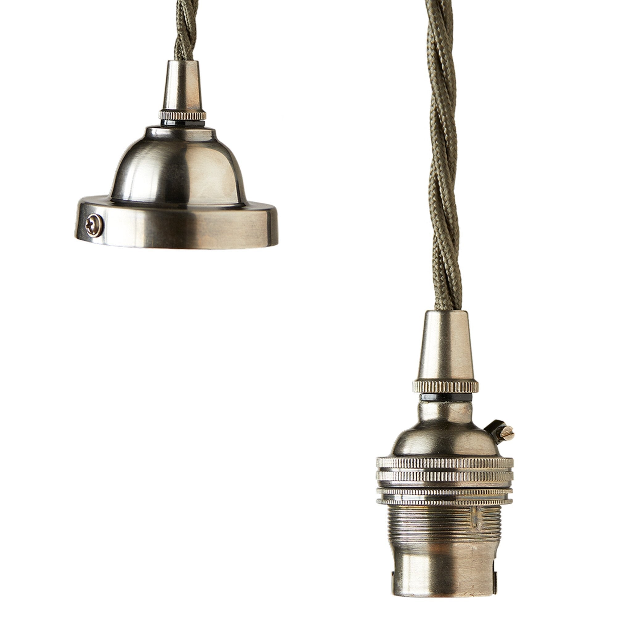 This is our entry level pendant set, made from pure brass and with our standard but fabulous olive green flex. It fits a traditional B-22 fitting and comes with 120cm of flex.