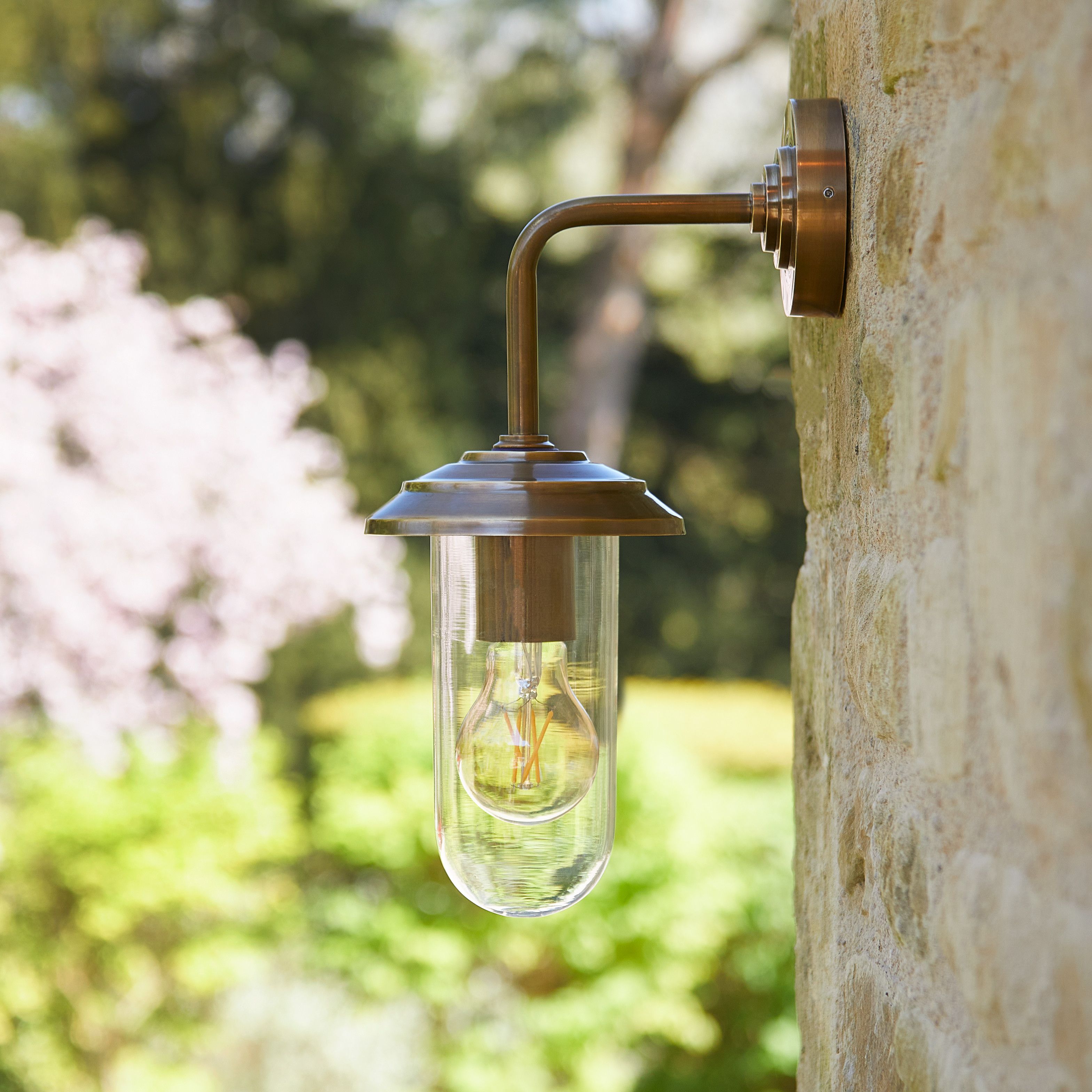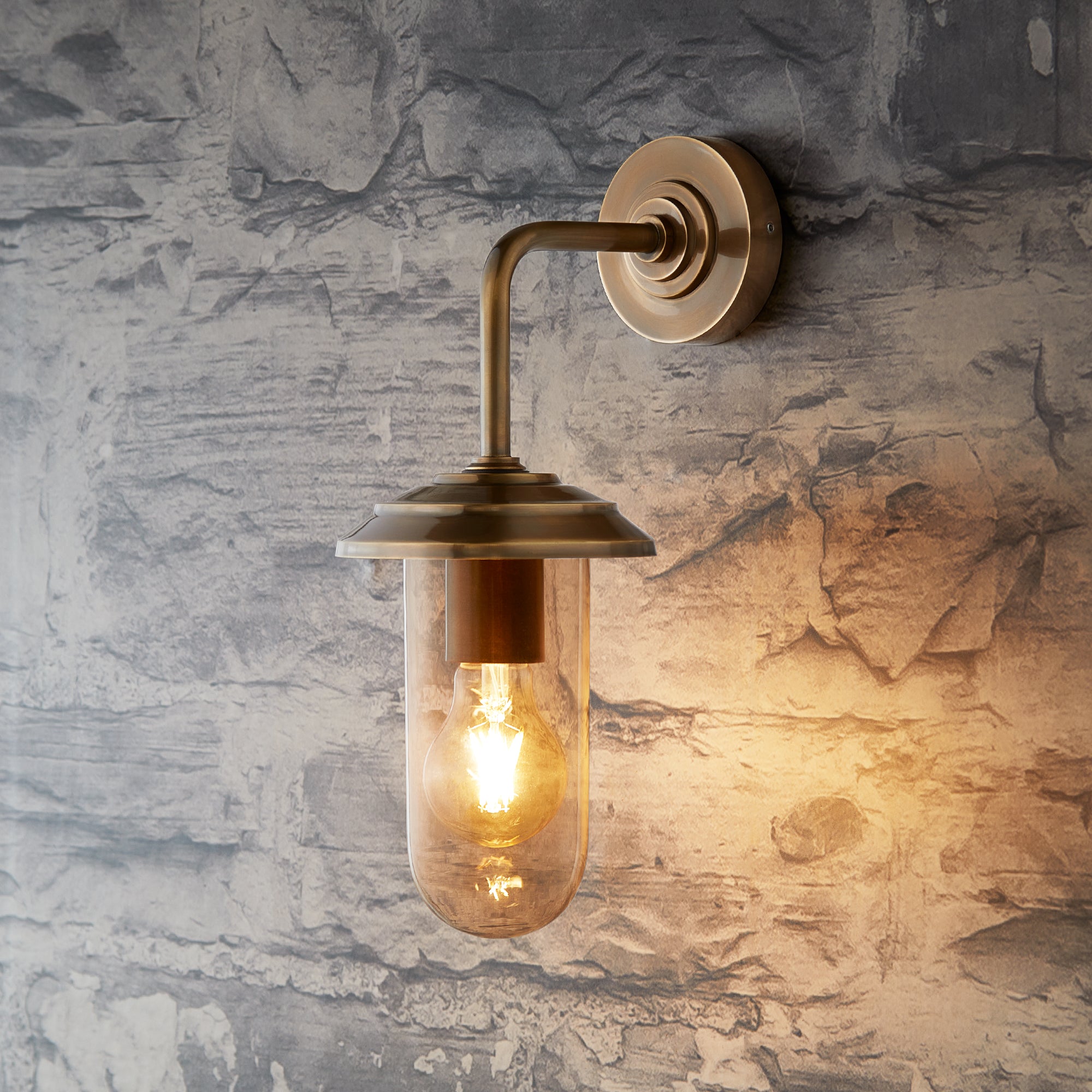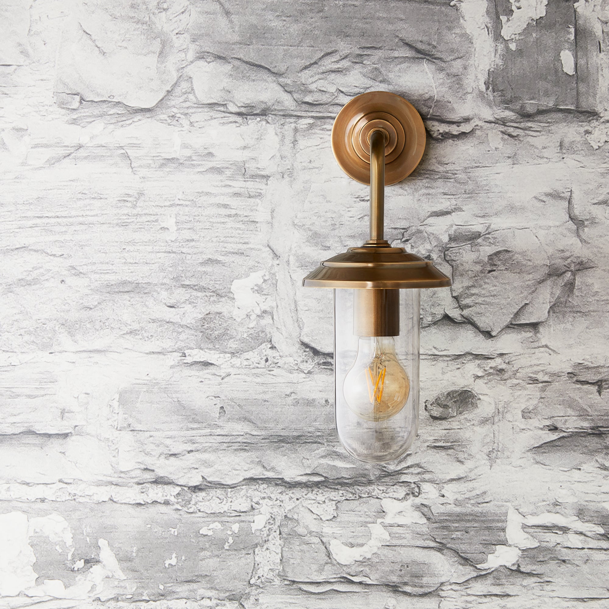 The concentric rings so beloved of art deco design, reproduced in a pure brass wall light. It will sit happily in your porch or elsewhere in the garden, or equally well if you bring it inside to adorn a bathroom or a cloakroom. Casts lots of ambient light.