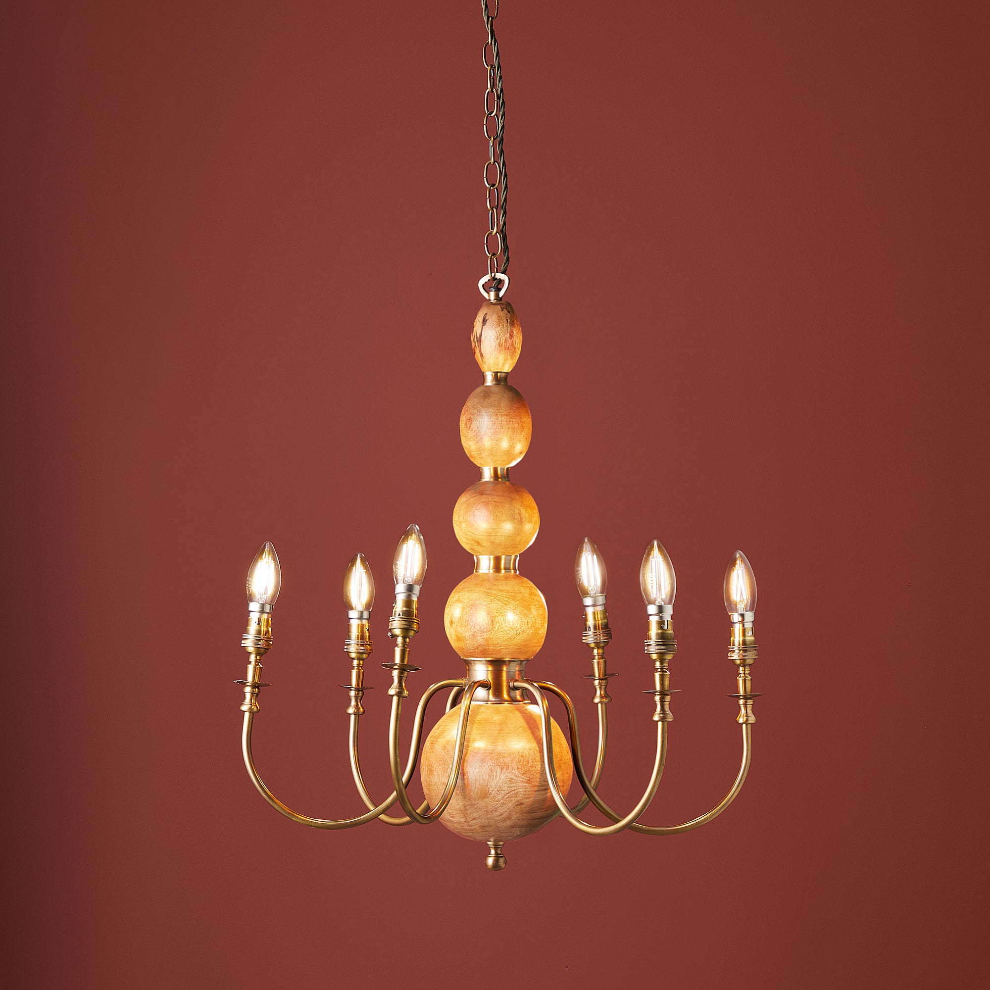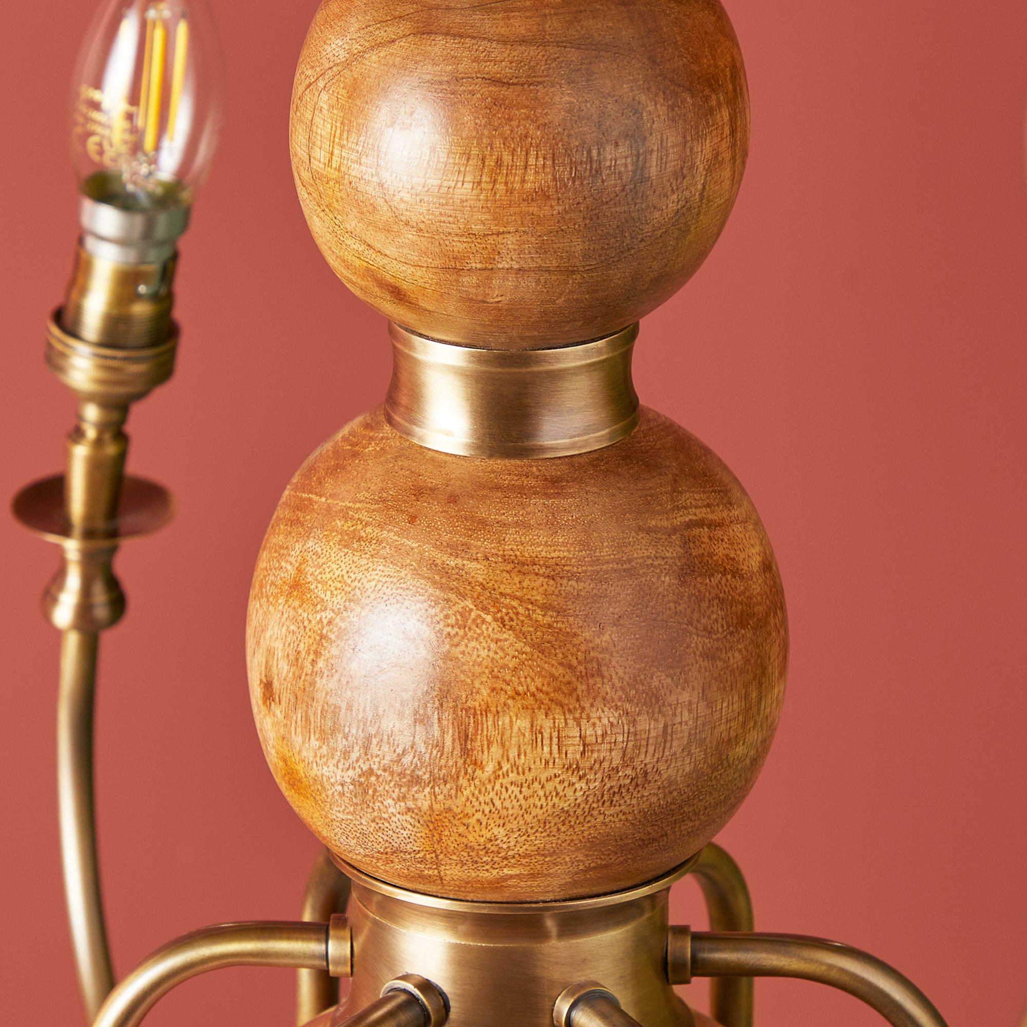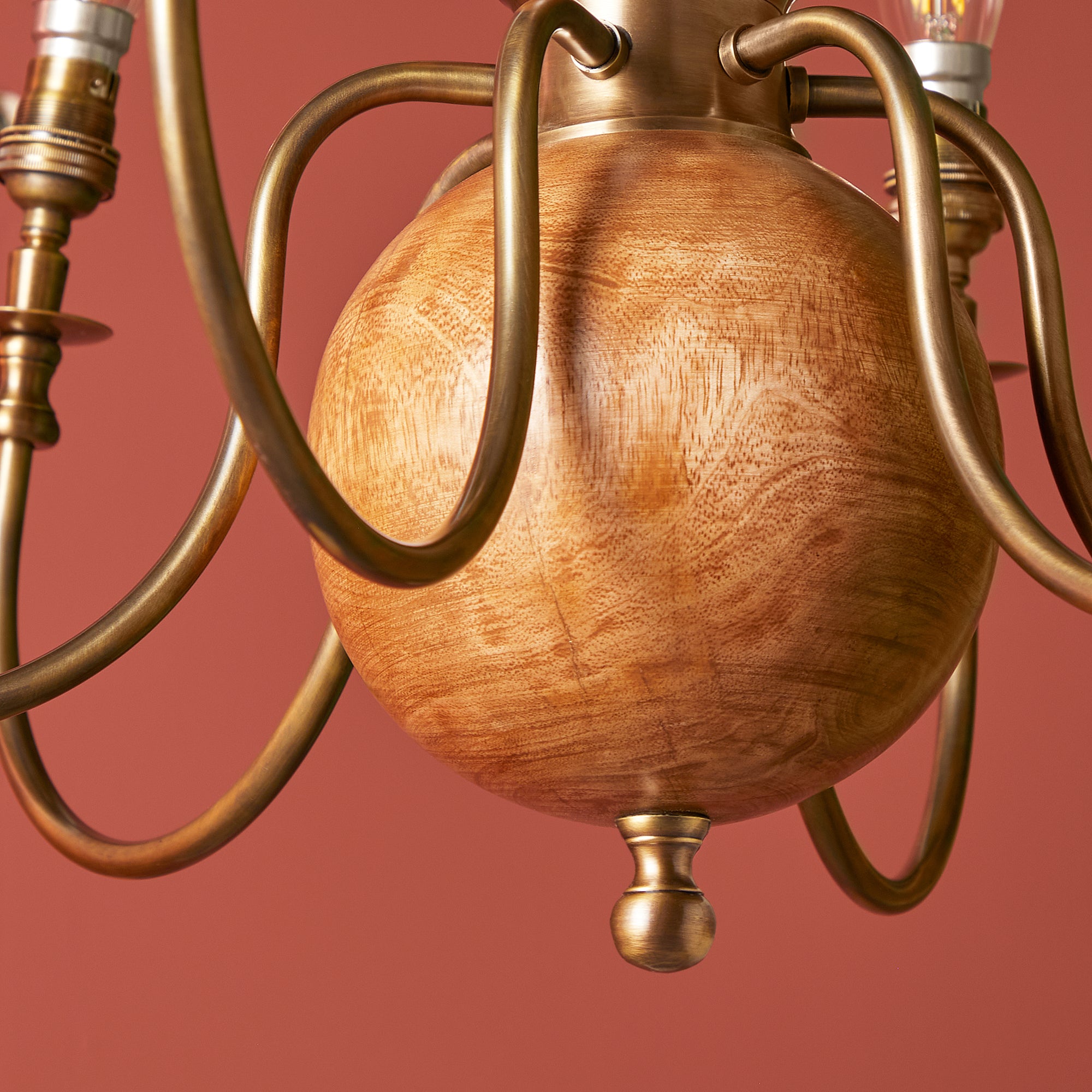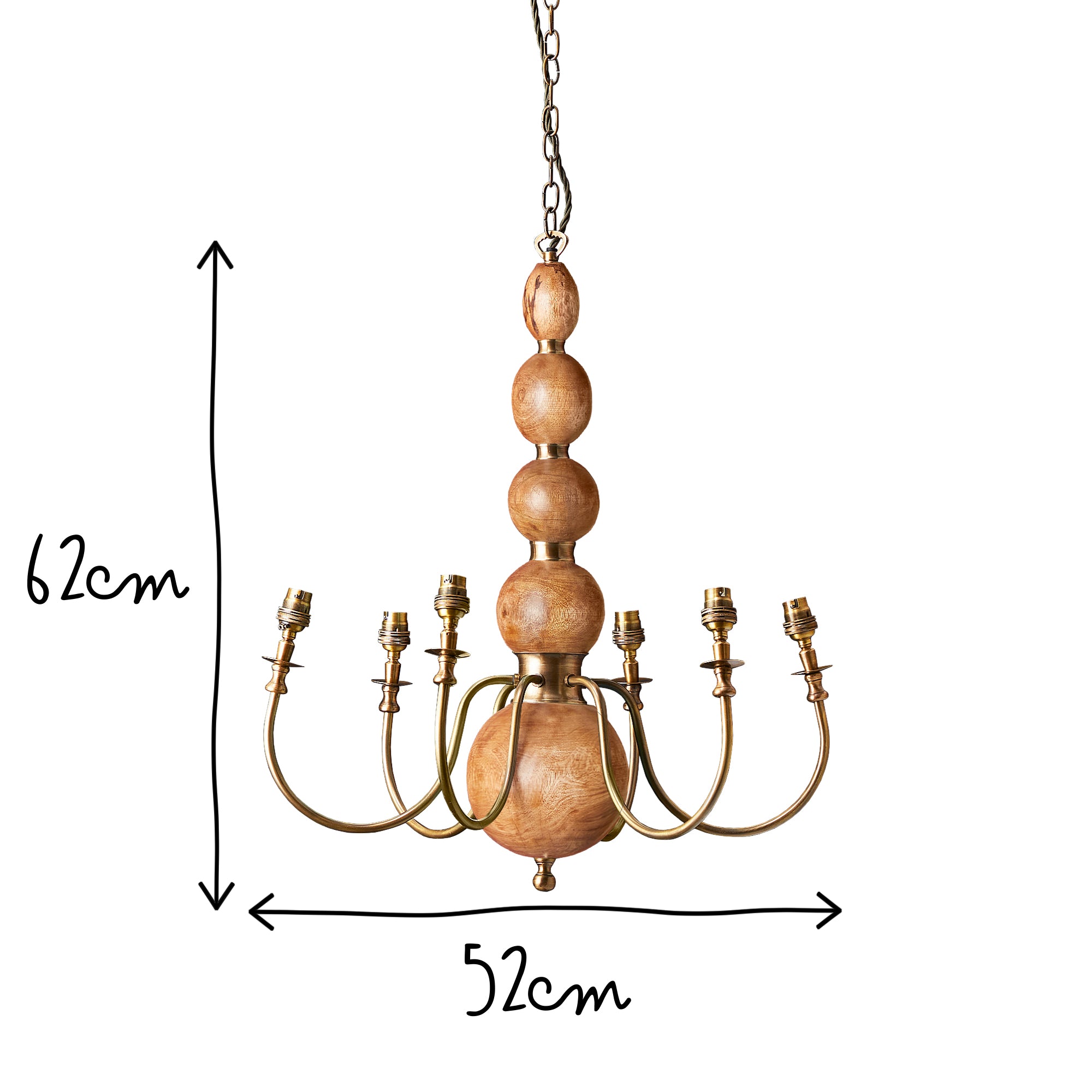 Goodness gracious, great balls of...natural waxed wood as it happens! From egg-ish to orb-ish, pretty brass collars in between and six curvaceous arms - conspiring happily to make a beautiful centrepiece.