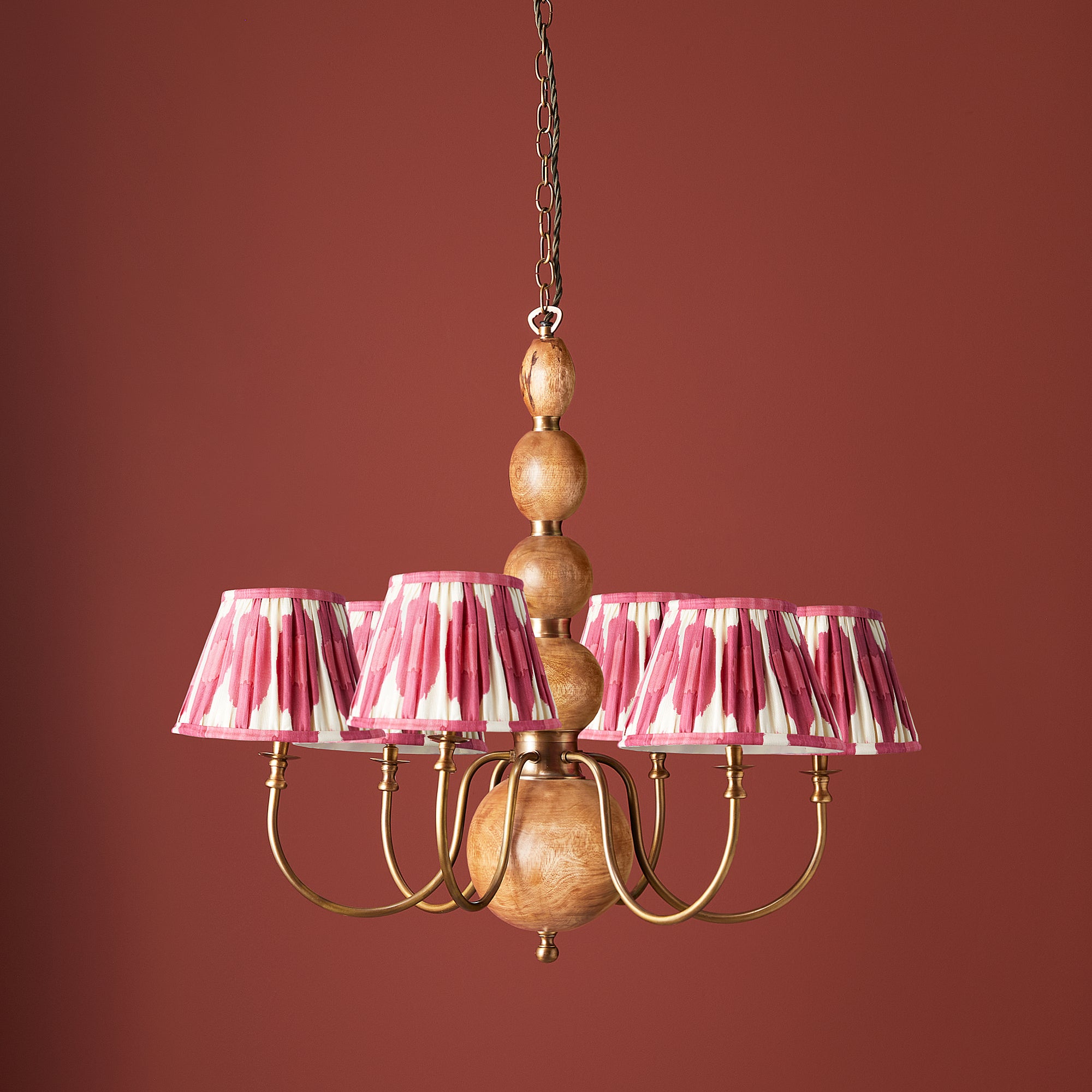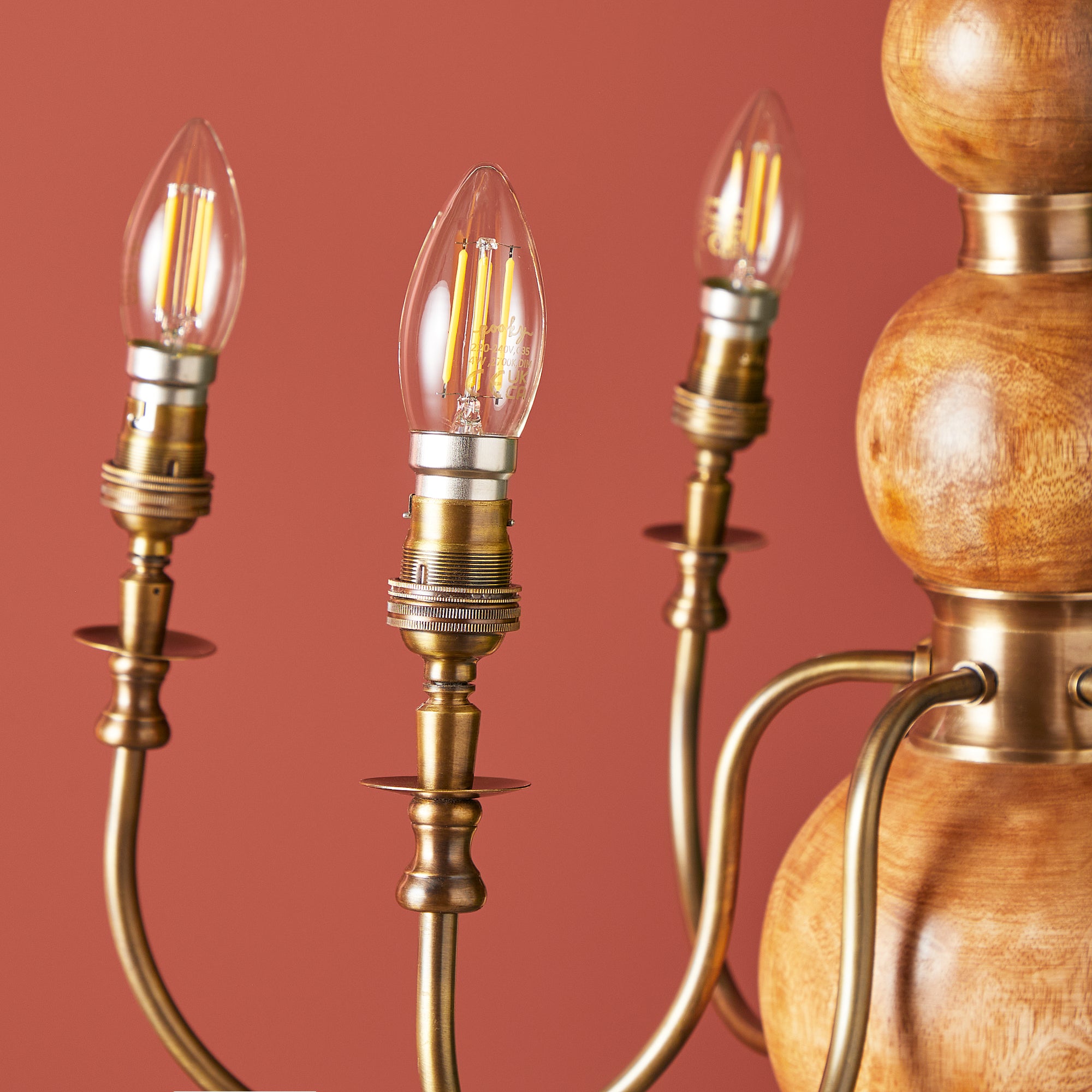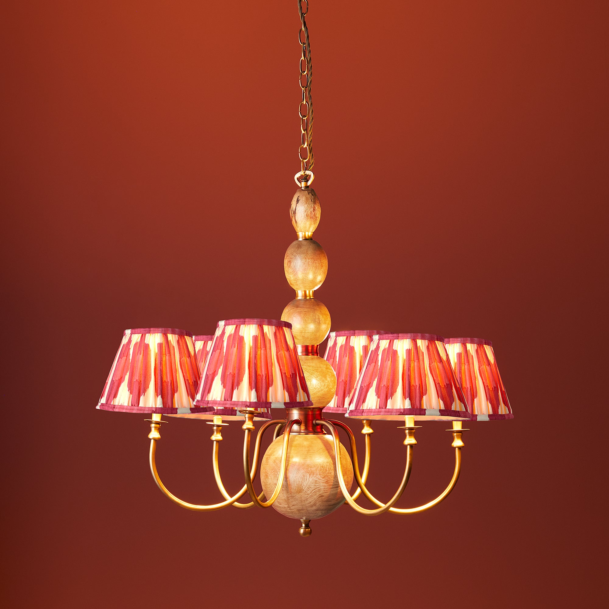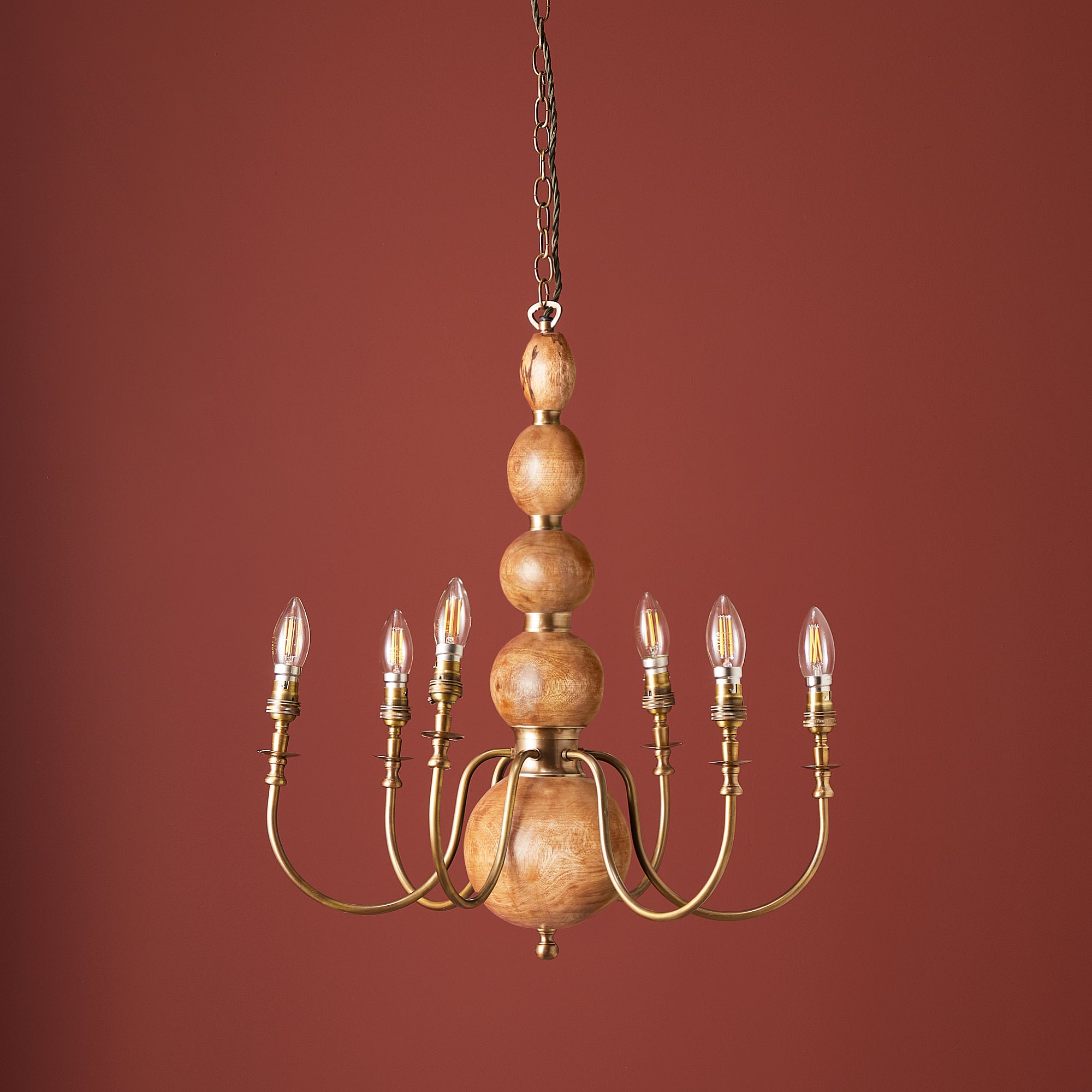 Goodness gracious, great balls of...natural waxed wood as it happens! From egg-ish to orb-ish, pretty brass collars in between and six curvaceous arms - conspiring happily to make a beautiful centrepiece.