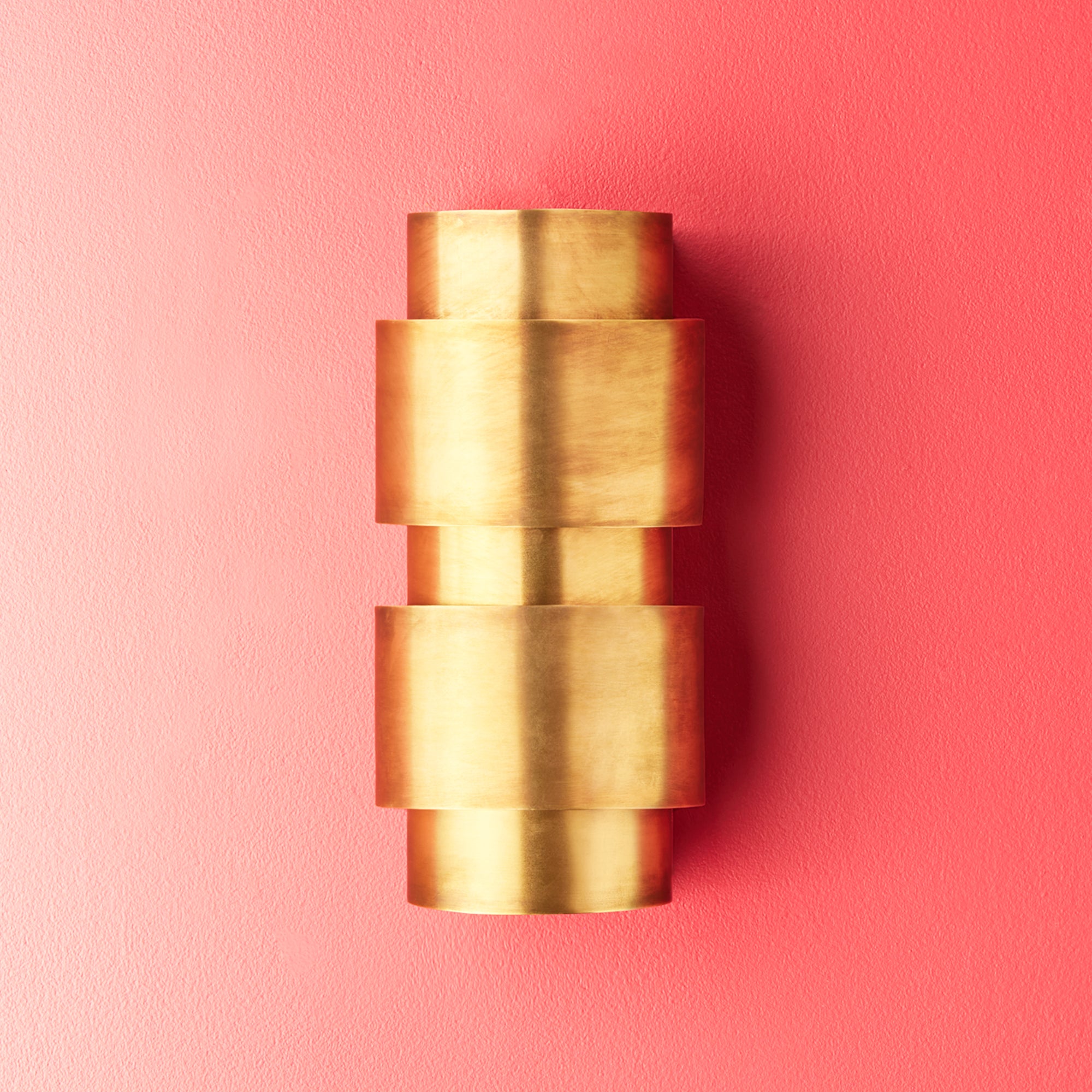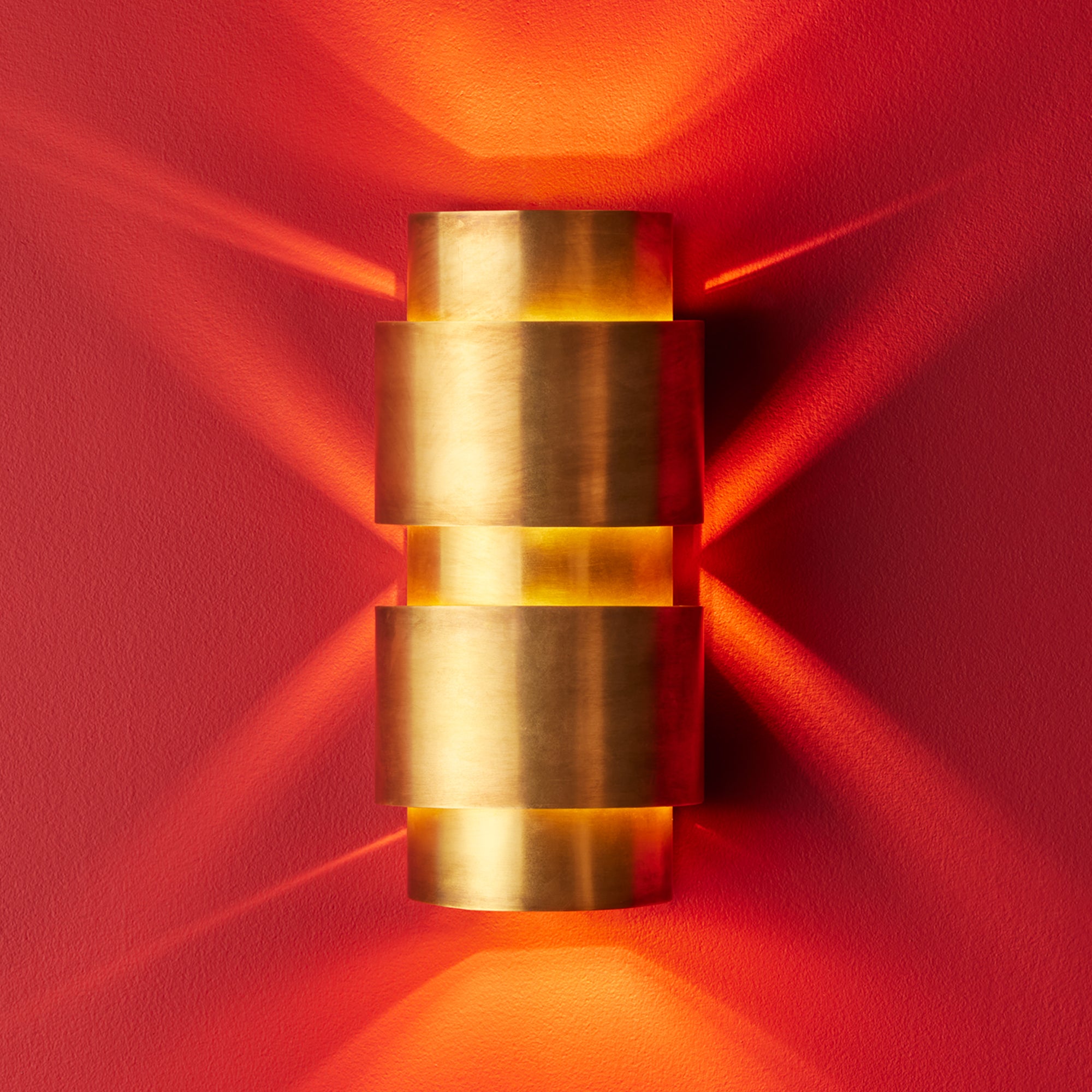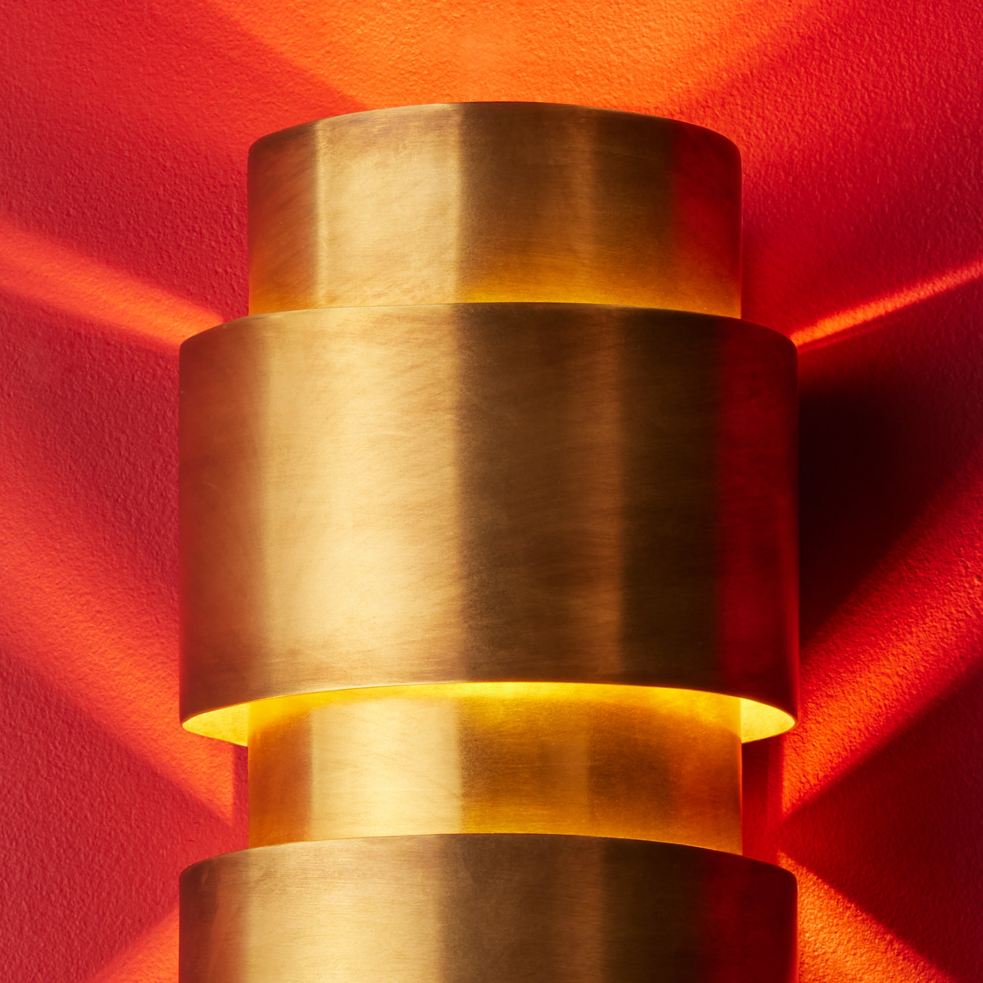 The five concentric brass rings allow for light to emanate from between them as well as from the top and bottom. An achingly cool mid century vibe that transforms and transports any space.