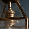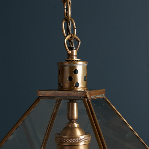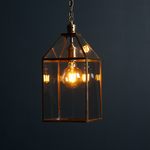 Very simple glass lantern pendant with antique brass frame, chain and ceiling rose. Hang singly or in groups with a filament bulb.