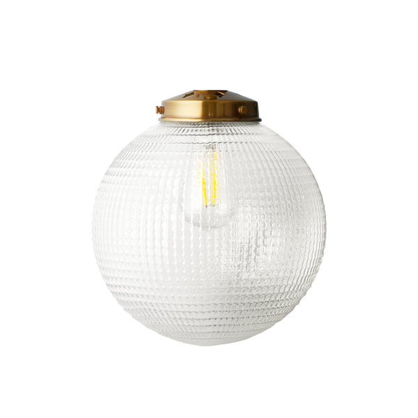 Simple really - a prismatic glass dome made from lovely blown glass. The prismatic waffle glass casts a subtle dappled light and the pattern gives off gentle texture. A gallery is required to allow this espere to hang from pendant kits and wall fittings.