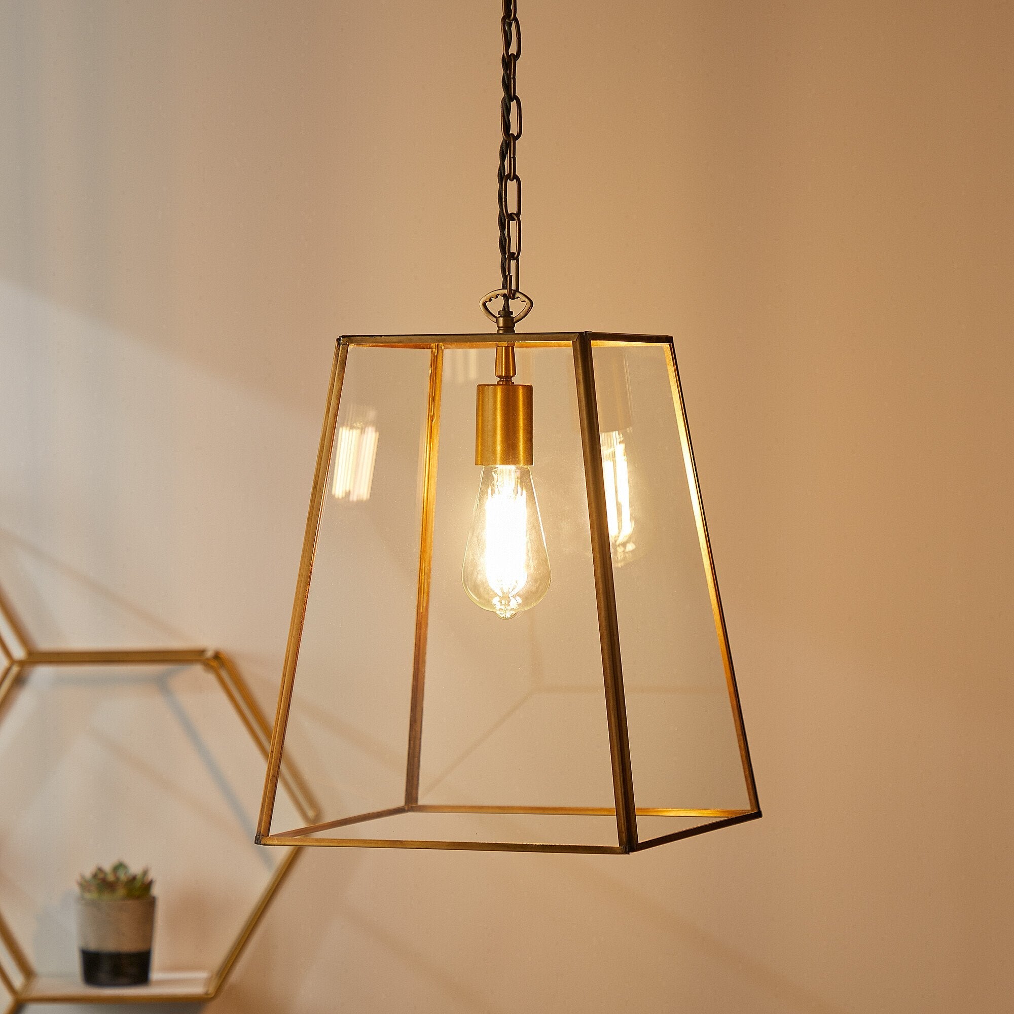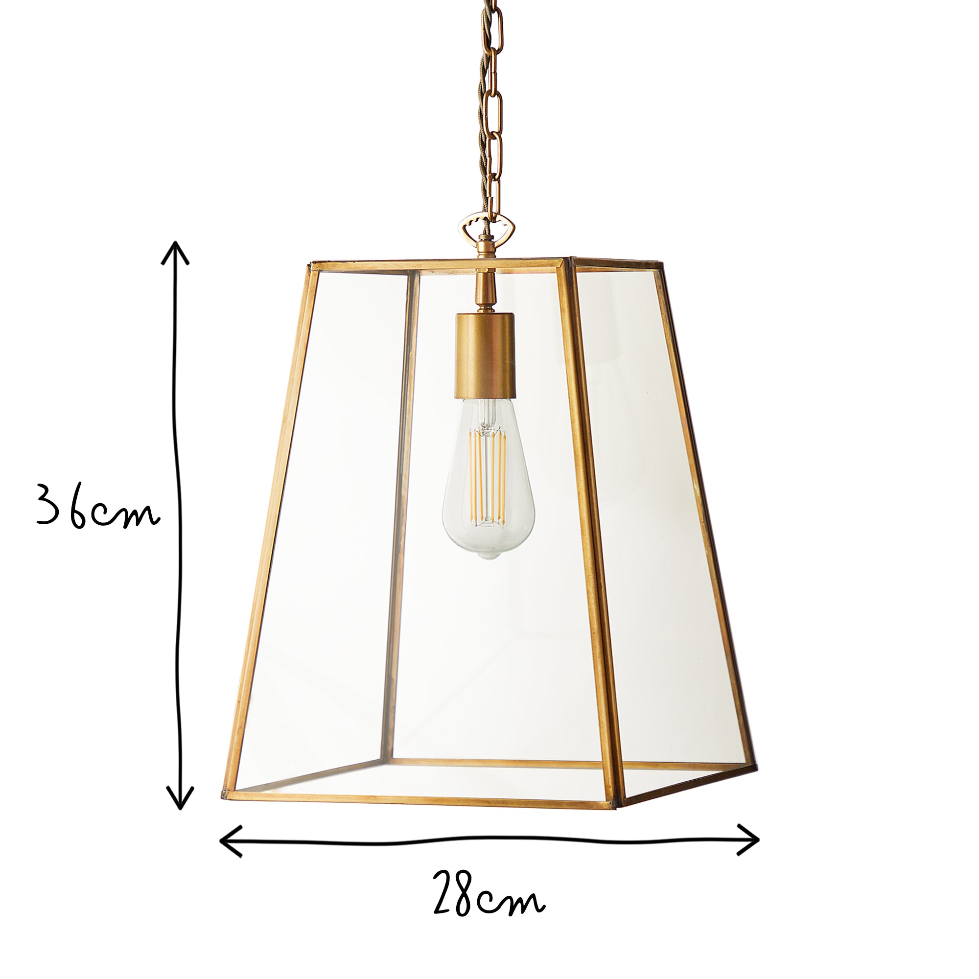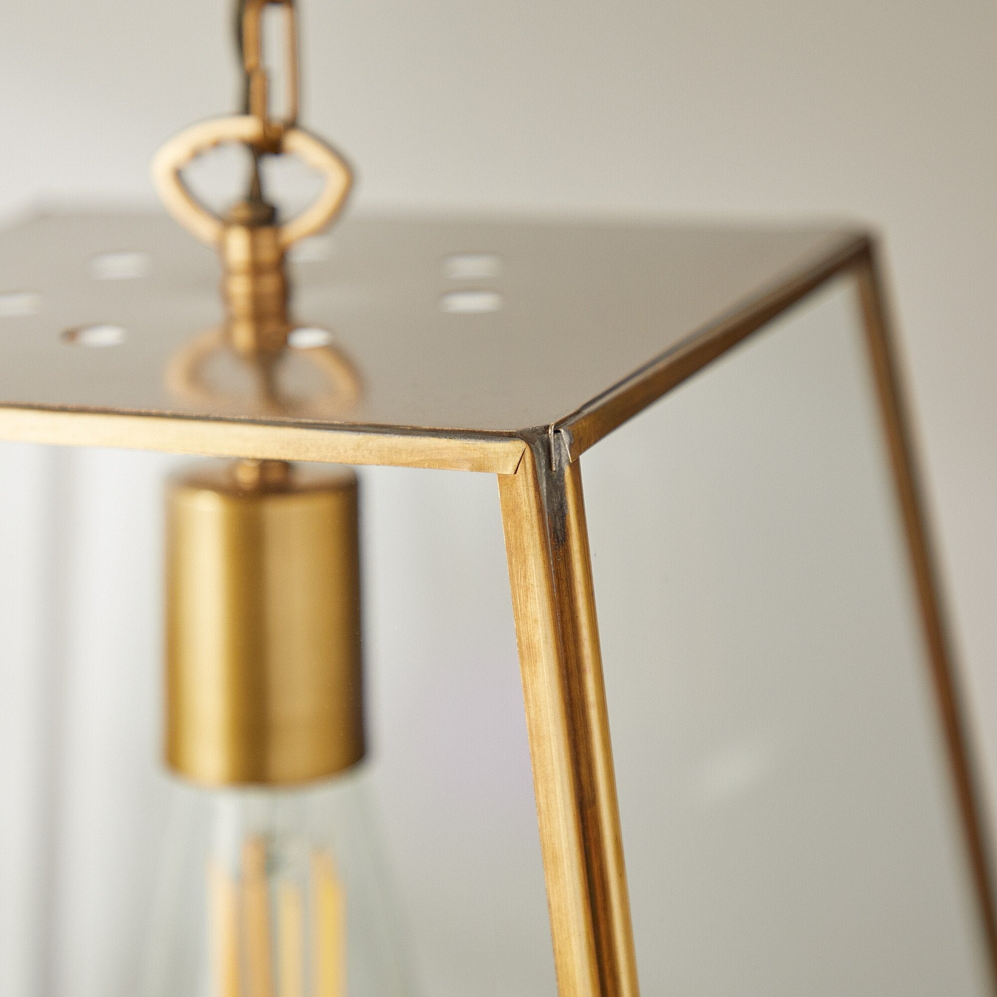 Simple glass pendant with sloped sides, all framed in gently antiqued brass work. The height of elegance.