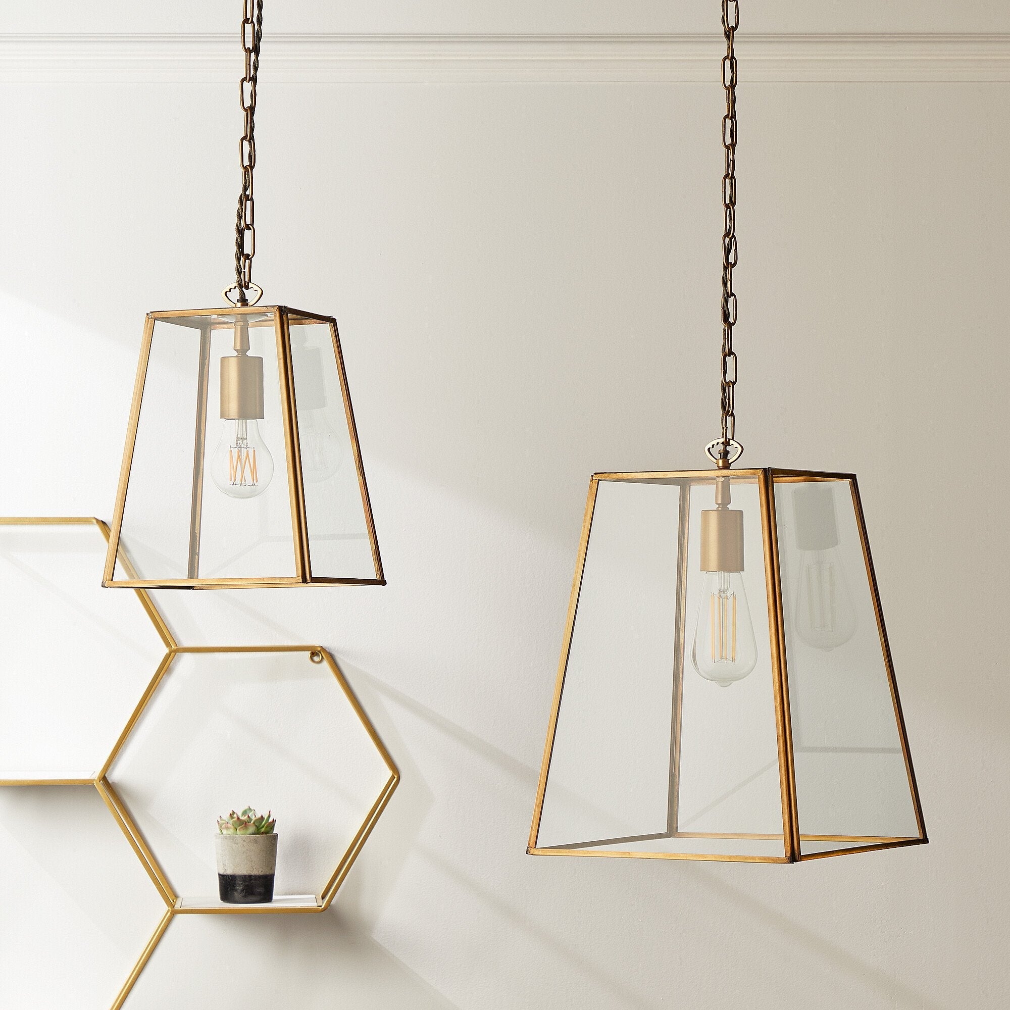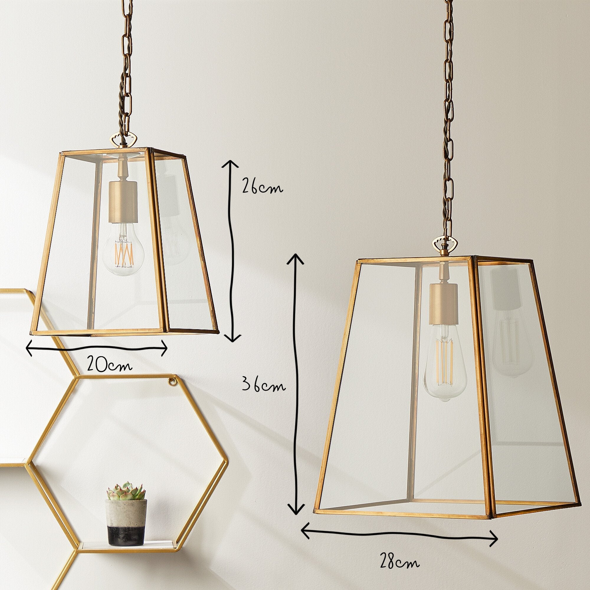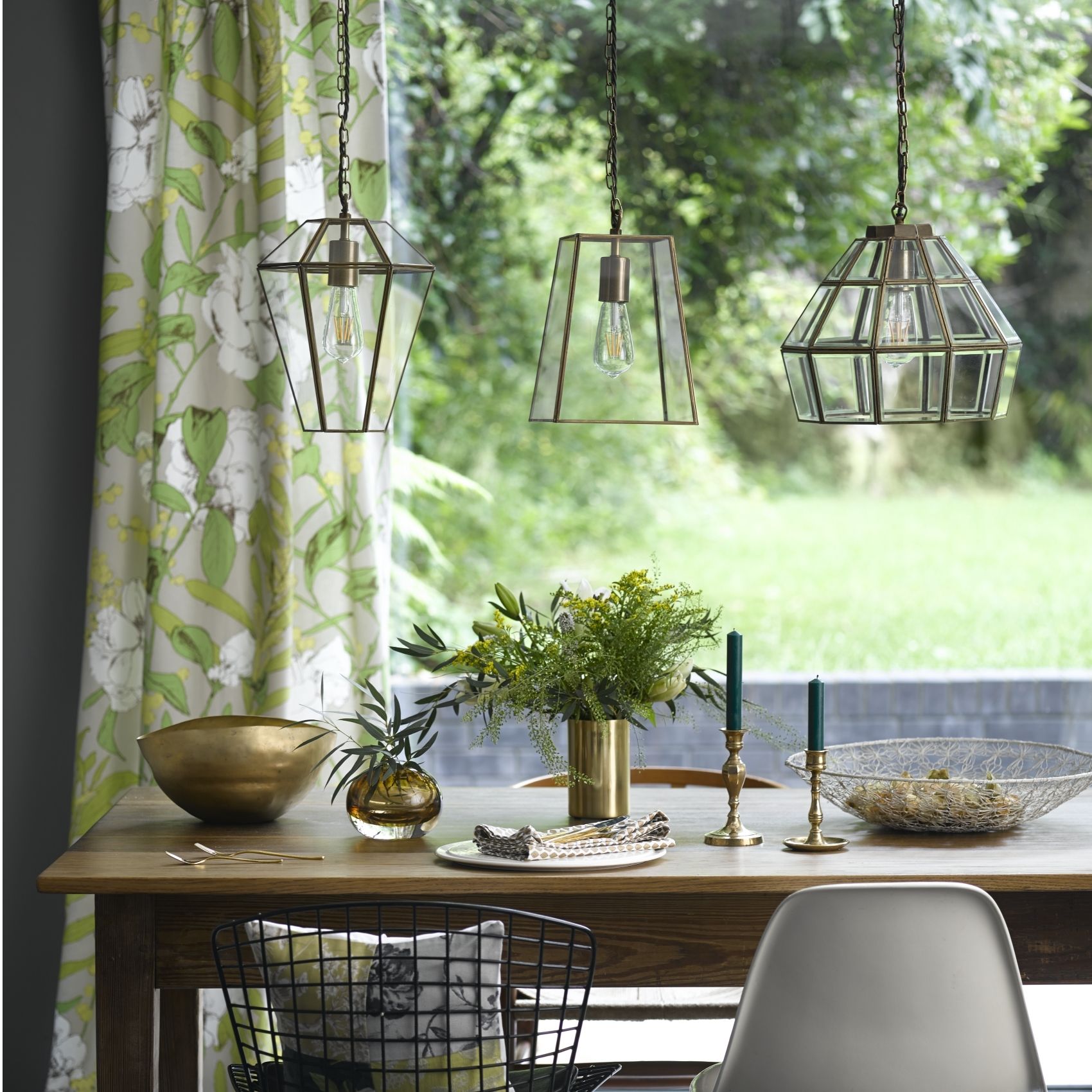 Simple glass pendant with sloped sides, all framed in gently antiqued brass work. The height of elegance.