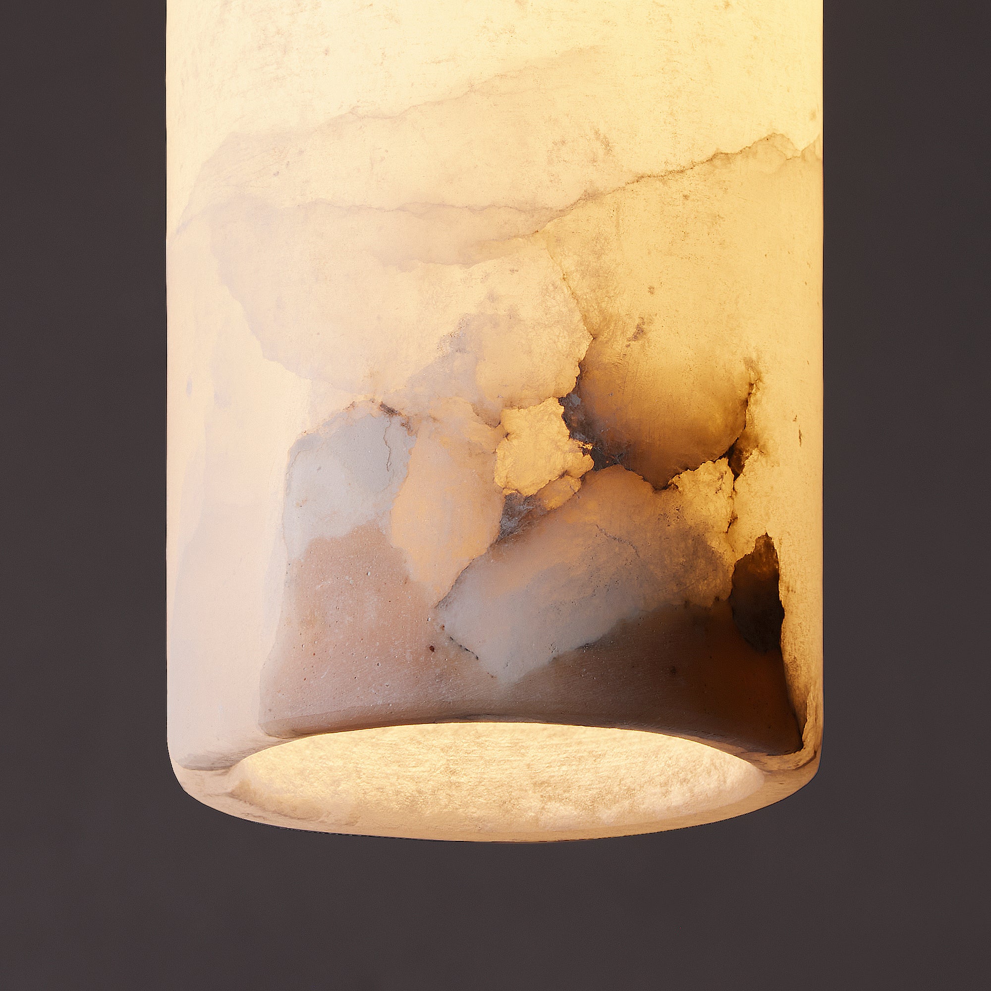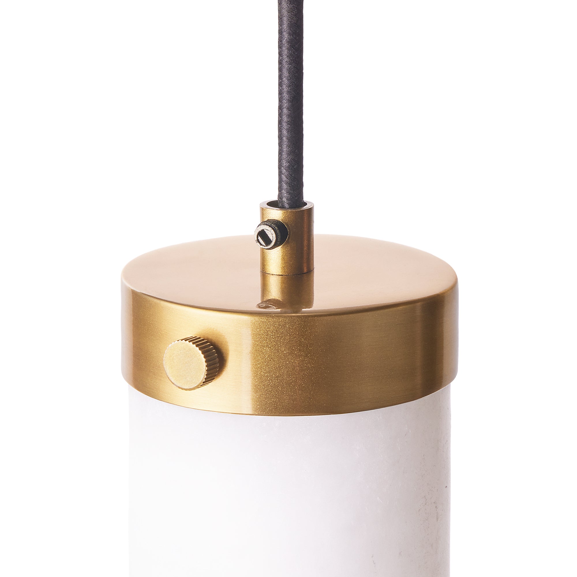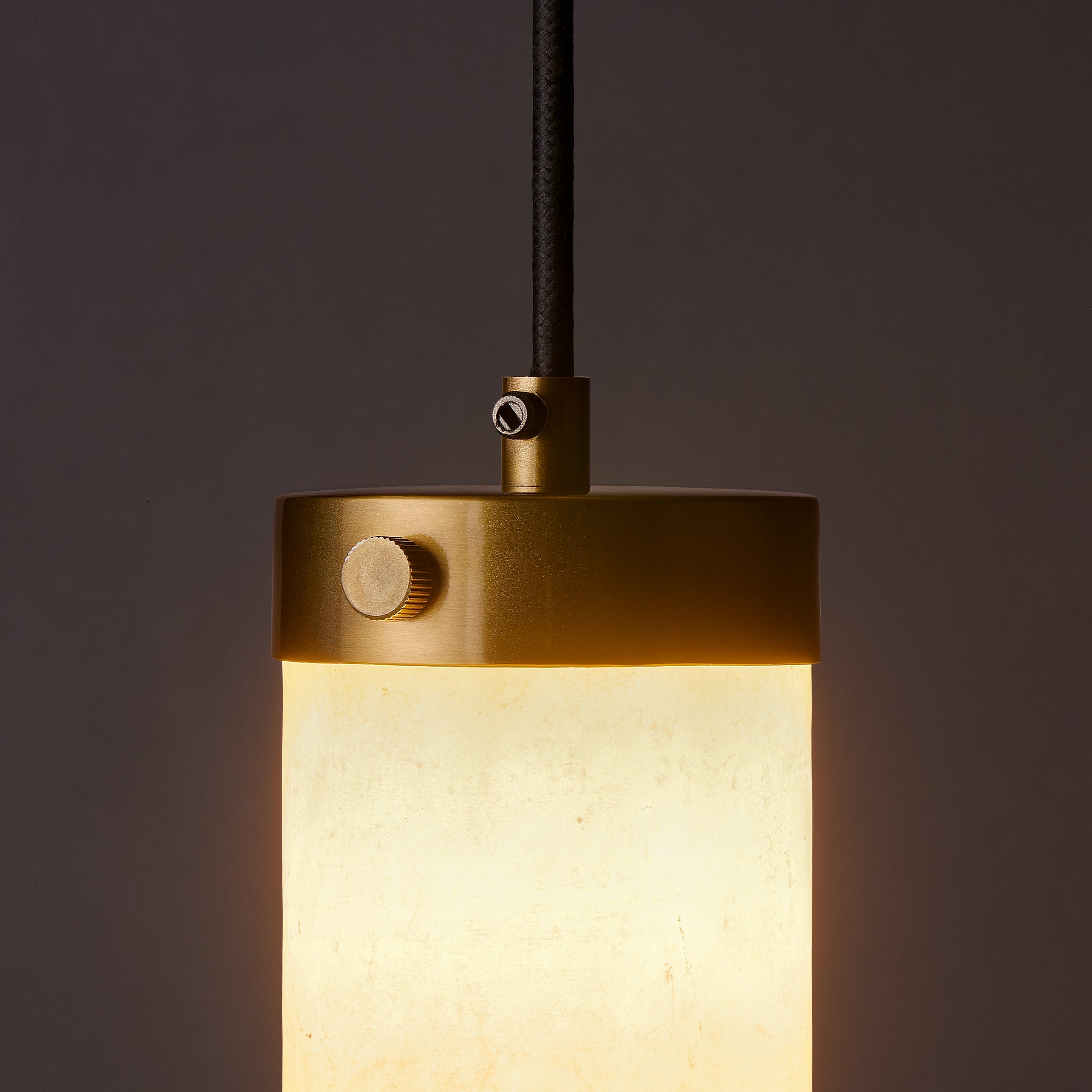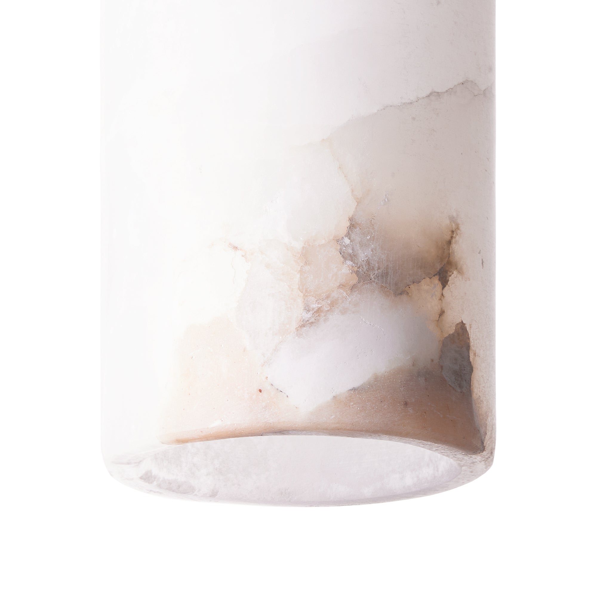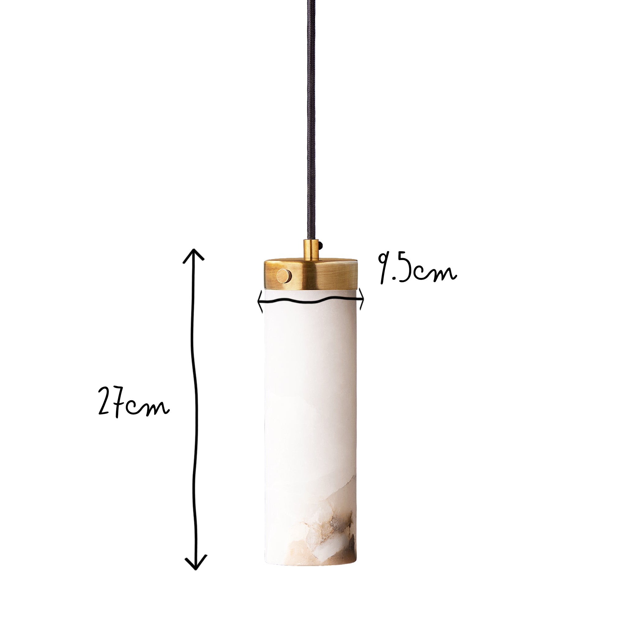If we said mini light sabre in white you might get the idea. A cylinder of alabaster hanging from a little brass hat, glowing in only that way that alabaster can. Very special, especially when hung in rows. Alabaster is a splendidly natural material, each piece boasts its own distinctive veining and appearance, making every light an utterly unique masterpiece.