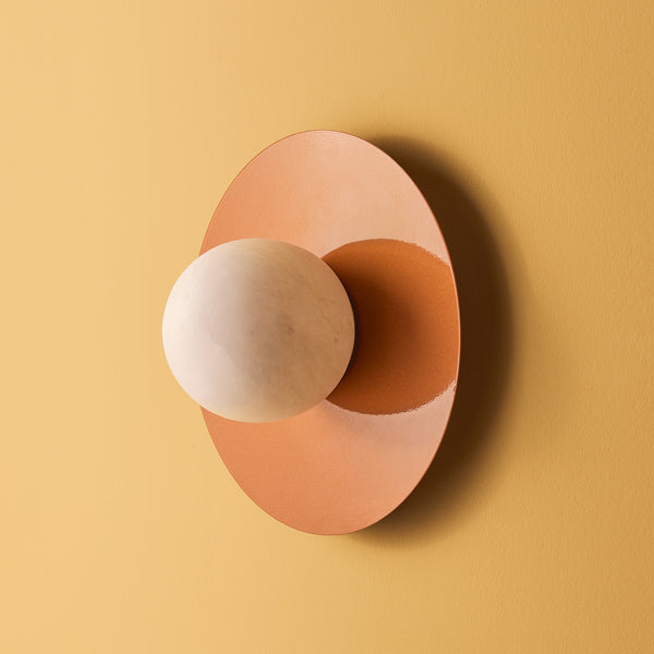 Our Leela wall light with a painted orange back plate. The beauty of alabaster is that every hand-carved ball is unique and throws off light in a slightly different manner...but always soft and delicate.