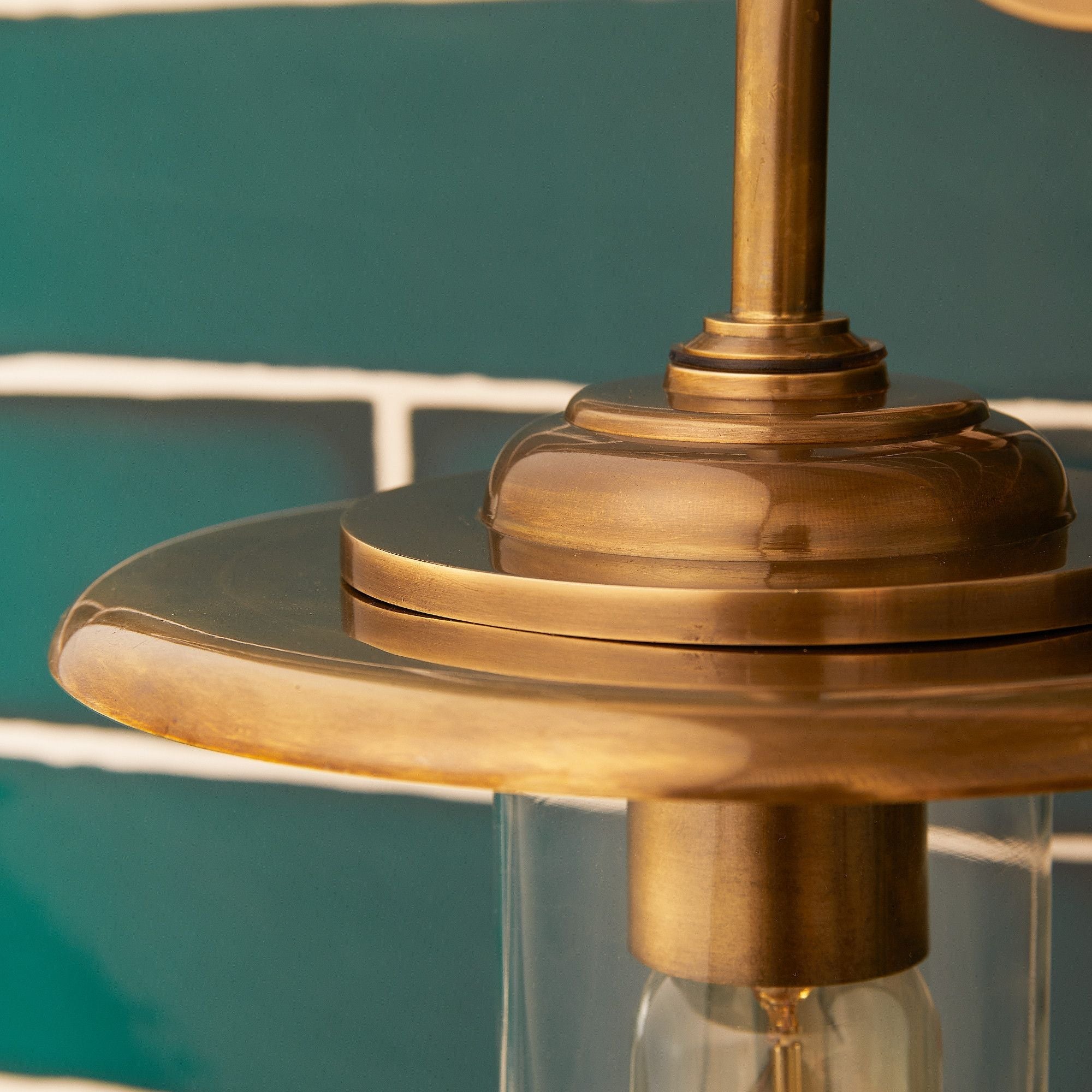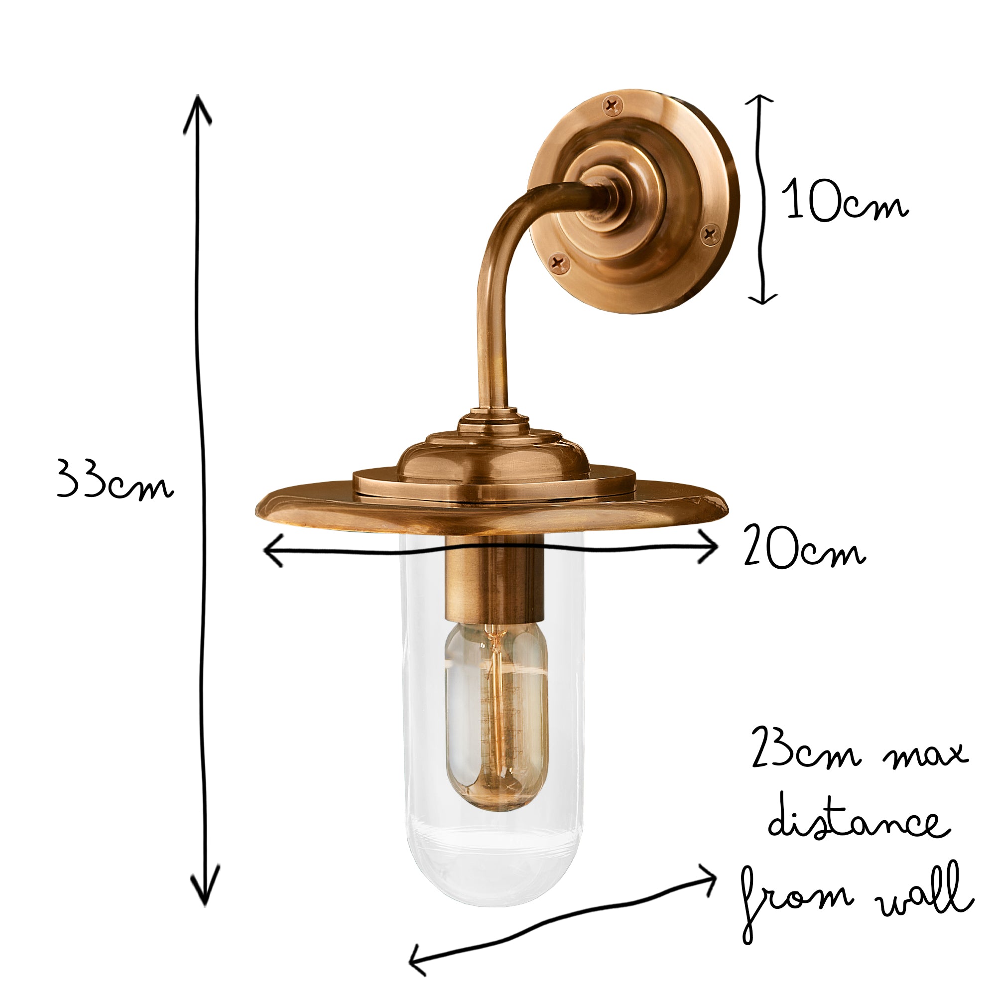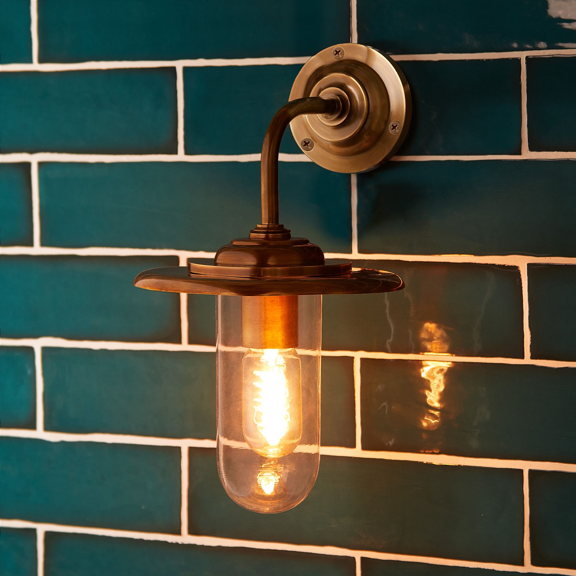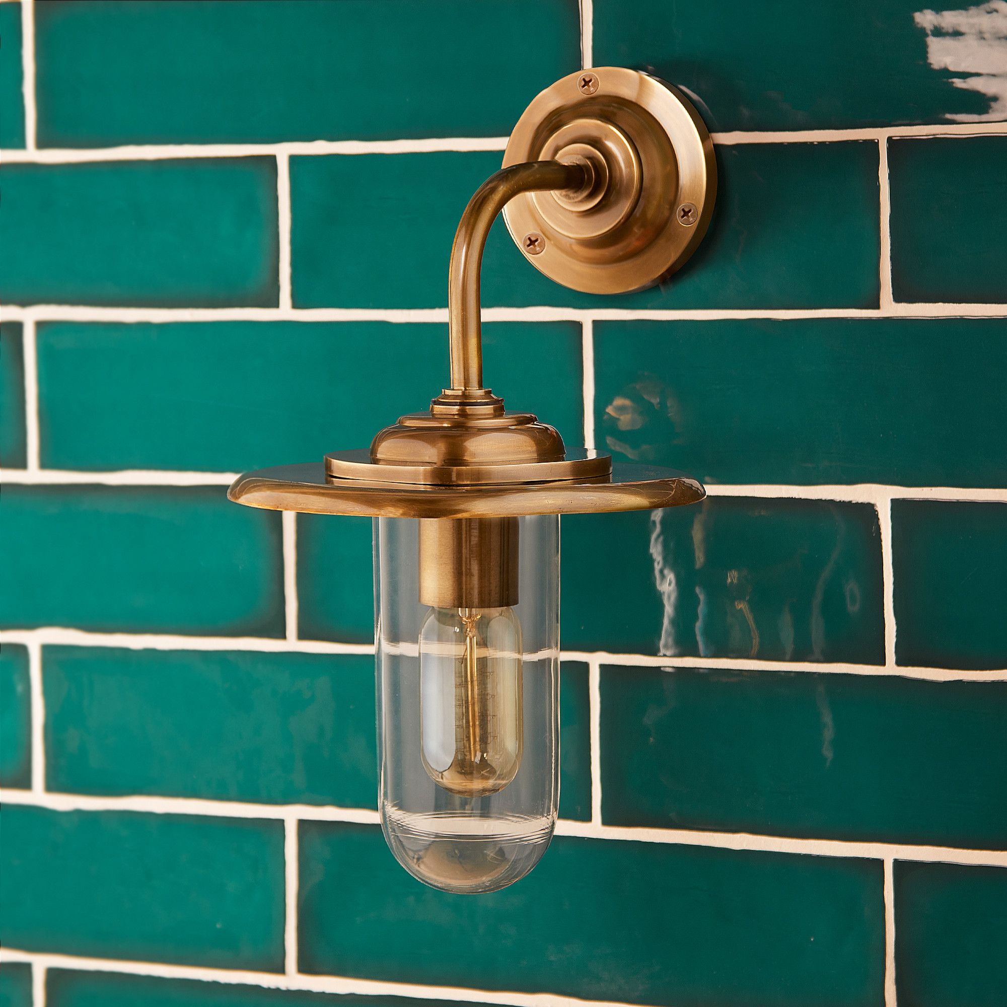 Sturdily made from brass and glass, this IP rated wall-light has a traditional feel to it will light up a porch or elsewhere in your garden with curvaceous applomb! But don't think you have to leave it outside - it's also a very capable performer in the bathroom. The wide, flat shade gives excellent ambient lighting without spreading its light upwards, so it's good for cosy!