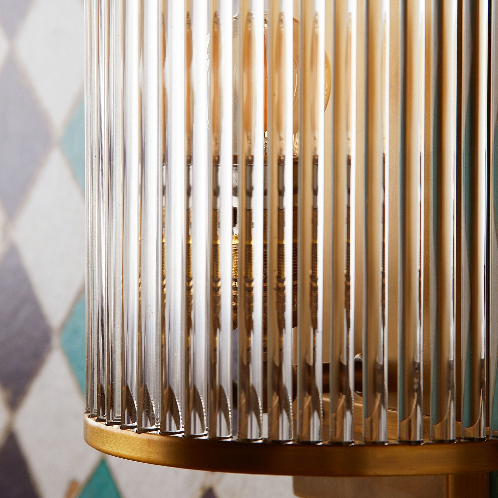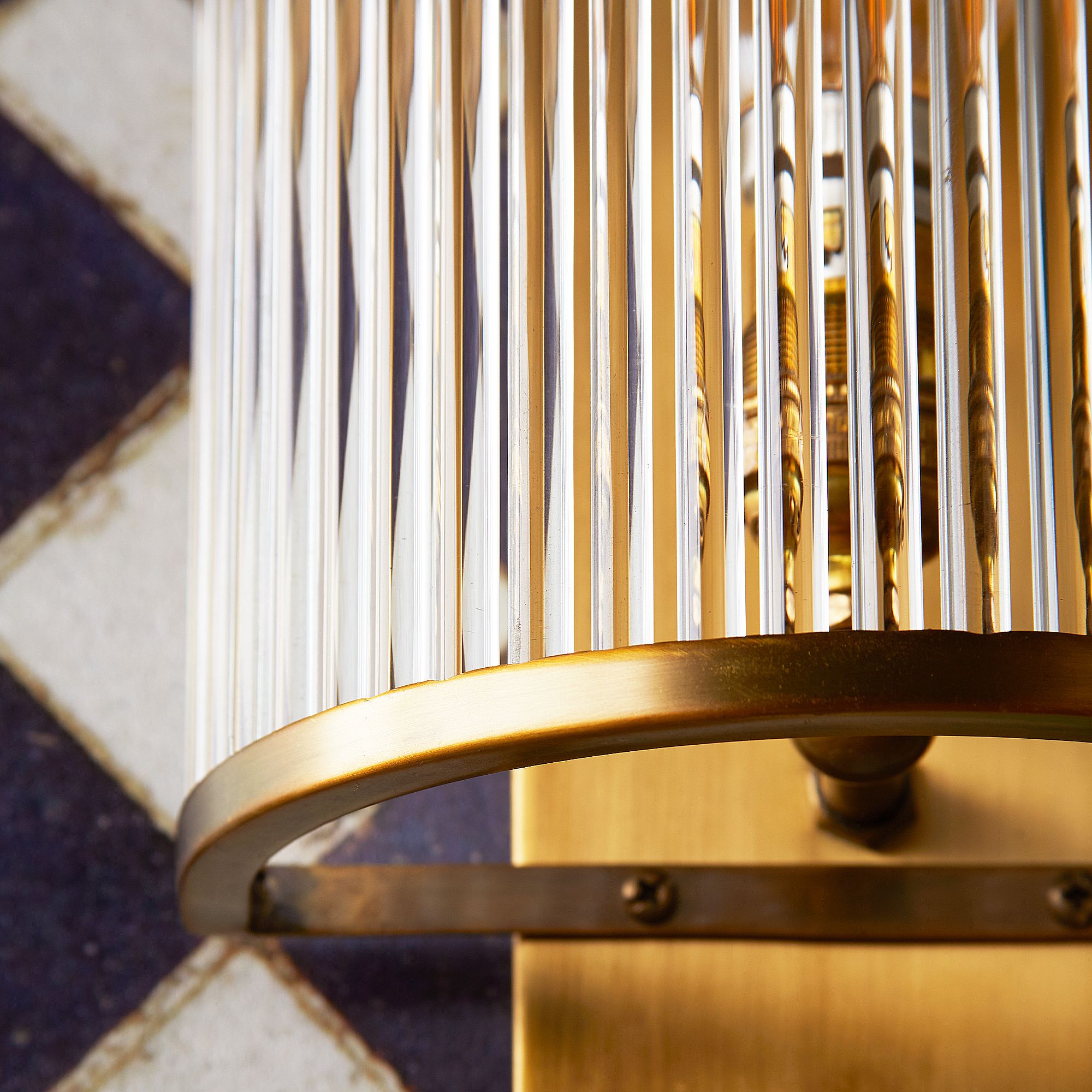Art Deco in feel this roddy wall light is a neat semi-circular wall sconce bordered by twenty glass rods, that let the light sparkle through.
