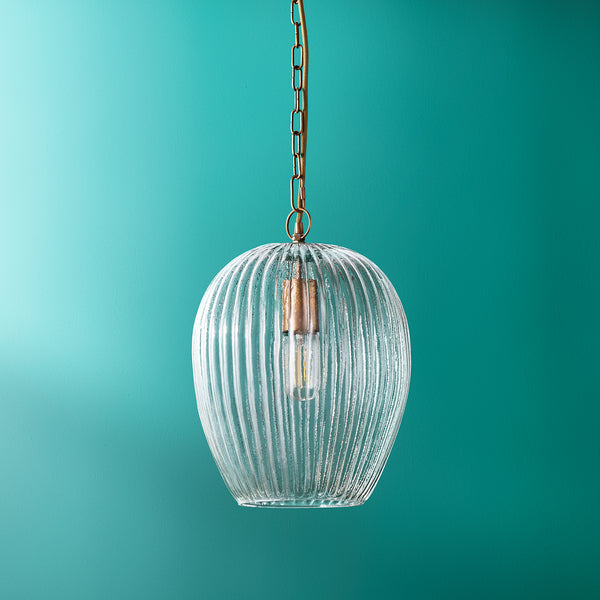 The ridges and furrows in this stunning blown glass pendant cast a soft wavy glow across the room. There is nothing straightforward about making this light - it takes considerable skill and finesse and there are many complex processes involved. But the destination is worth the journey. Oh yes...