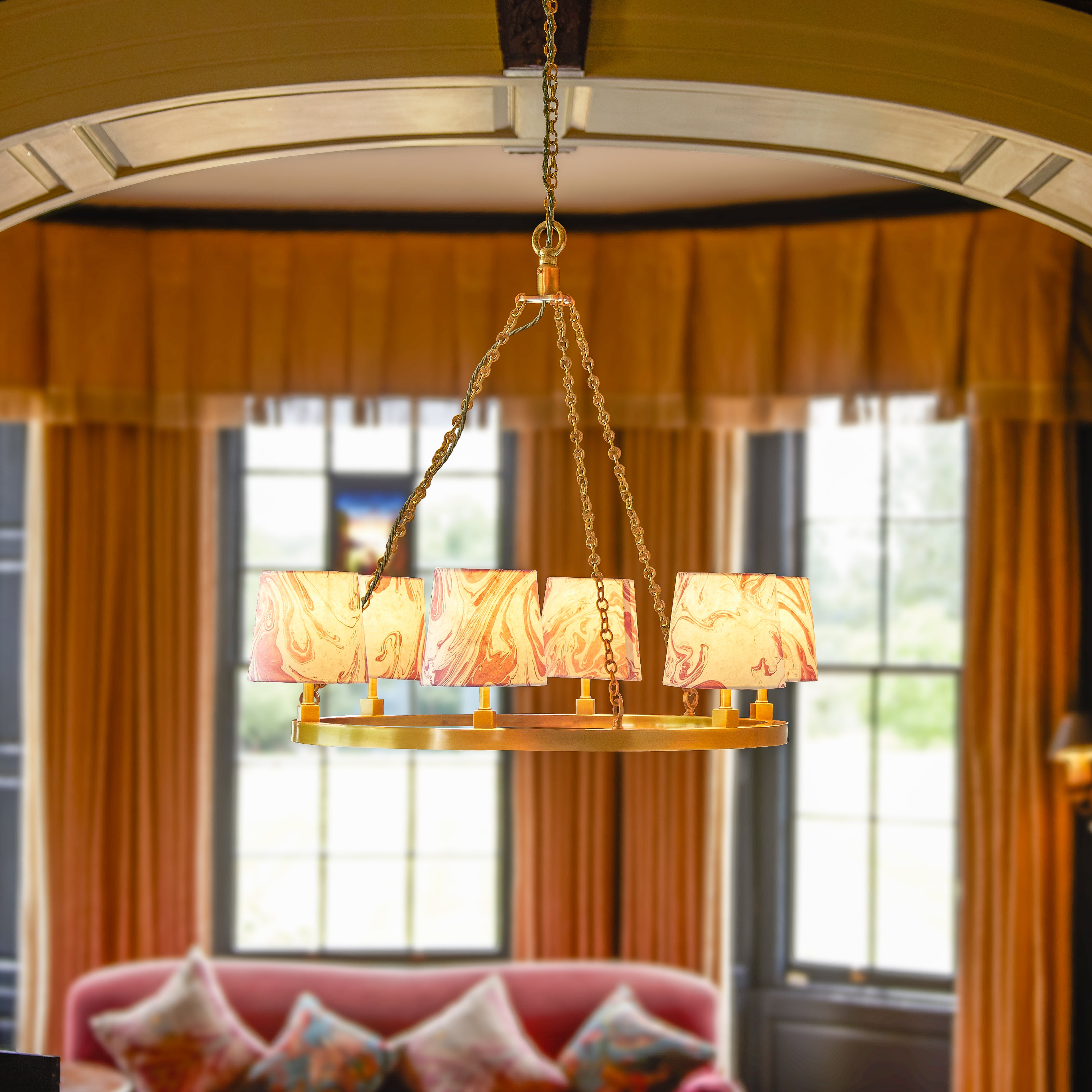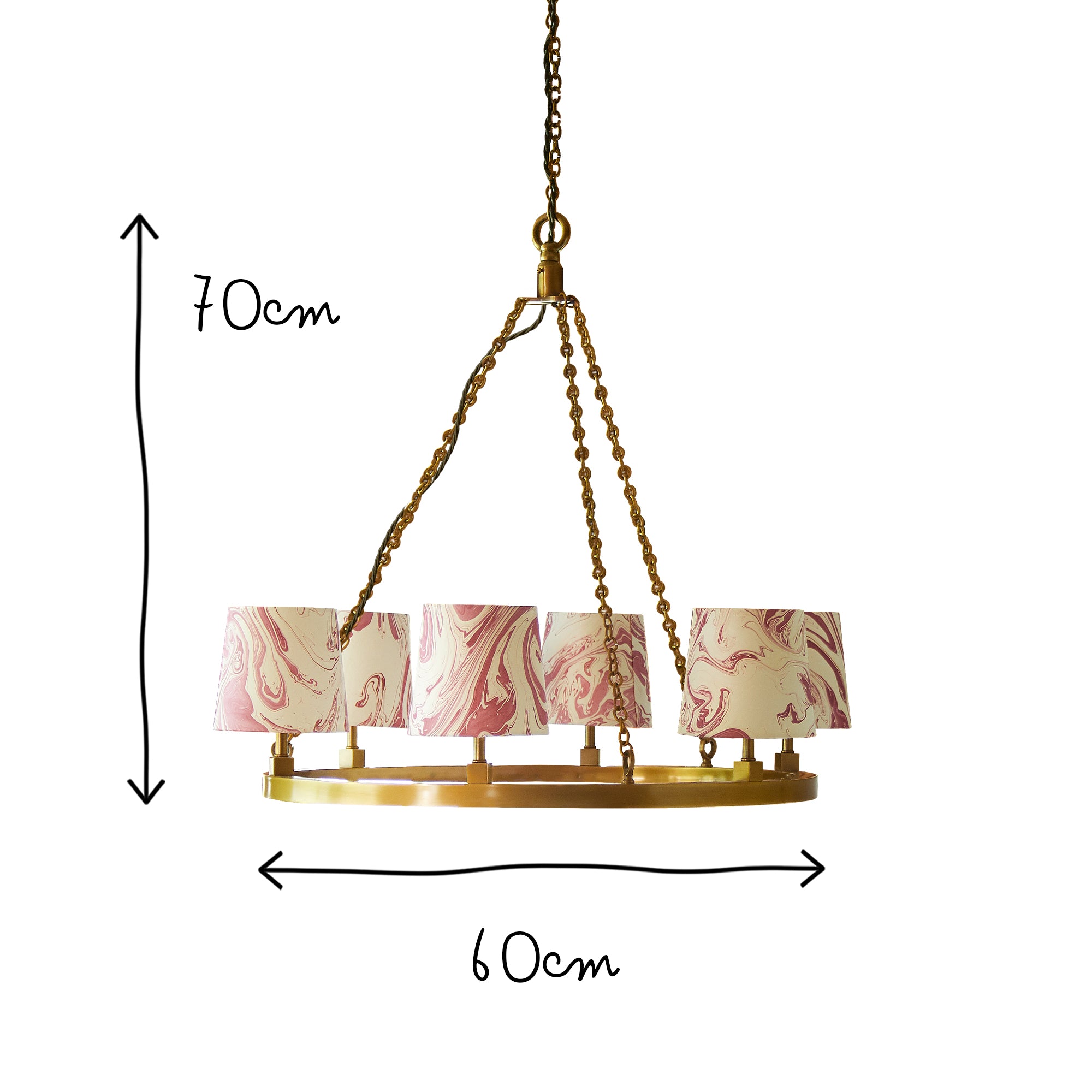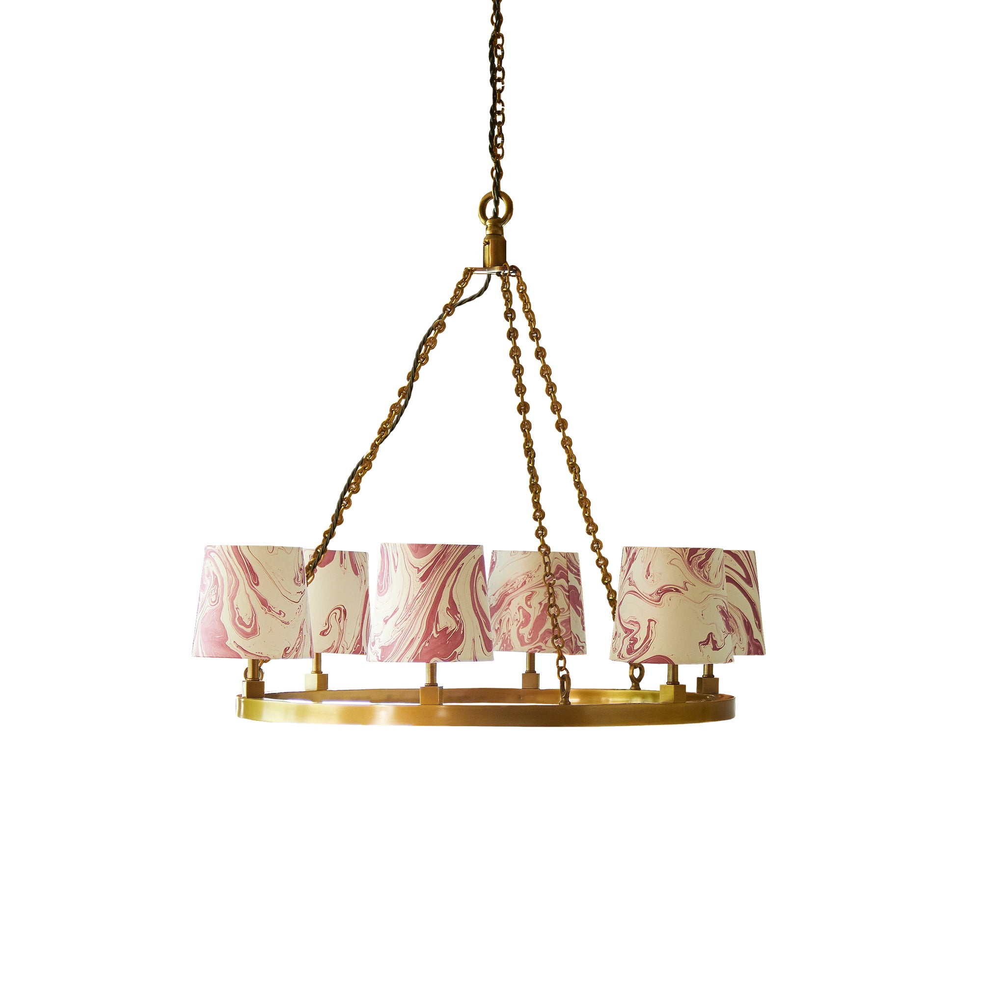 If you search the web you will find a few similar things to our Halo chandelier - but they tend to be overly showy, or baronial, or bling, or....hideously expensive. We wanted to create understated class with a simple, but strong, perfect halo of polished solid brass. We are thrilled with it - it packs a punch without showing off. And you don't need to live in a palace. It will easily hold its own in a grand vestibule but it will also sit happily over a small round table, for example, without overpowering the space. And if you do want it to shout out loud...then do so with the shades!