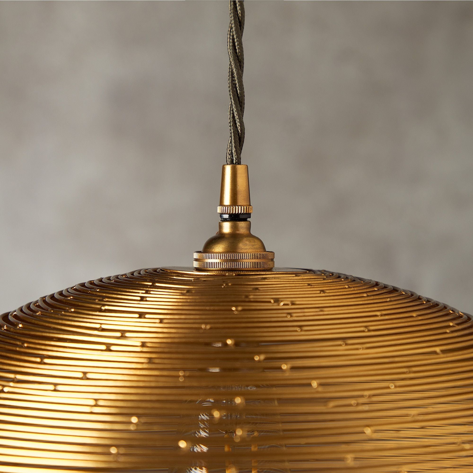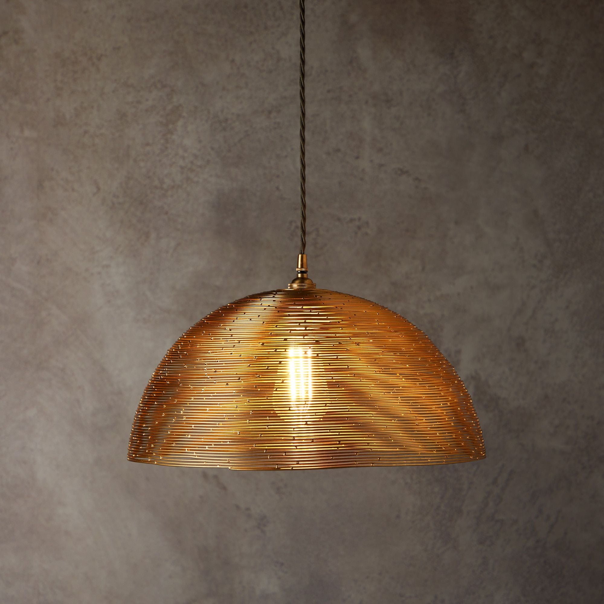 Imagine the neatest of birds nests. Remove the fluffy inside, replace the neatly twined twigs with brass wire, turn upside down and add a bulb - and you'll have an idea of how we dreamed up this lovely pendant. And when you switch it on, the light pools down beneath and it also escapes in little chinks of sparkle through the wire. A showstopper!