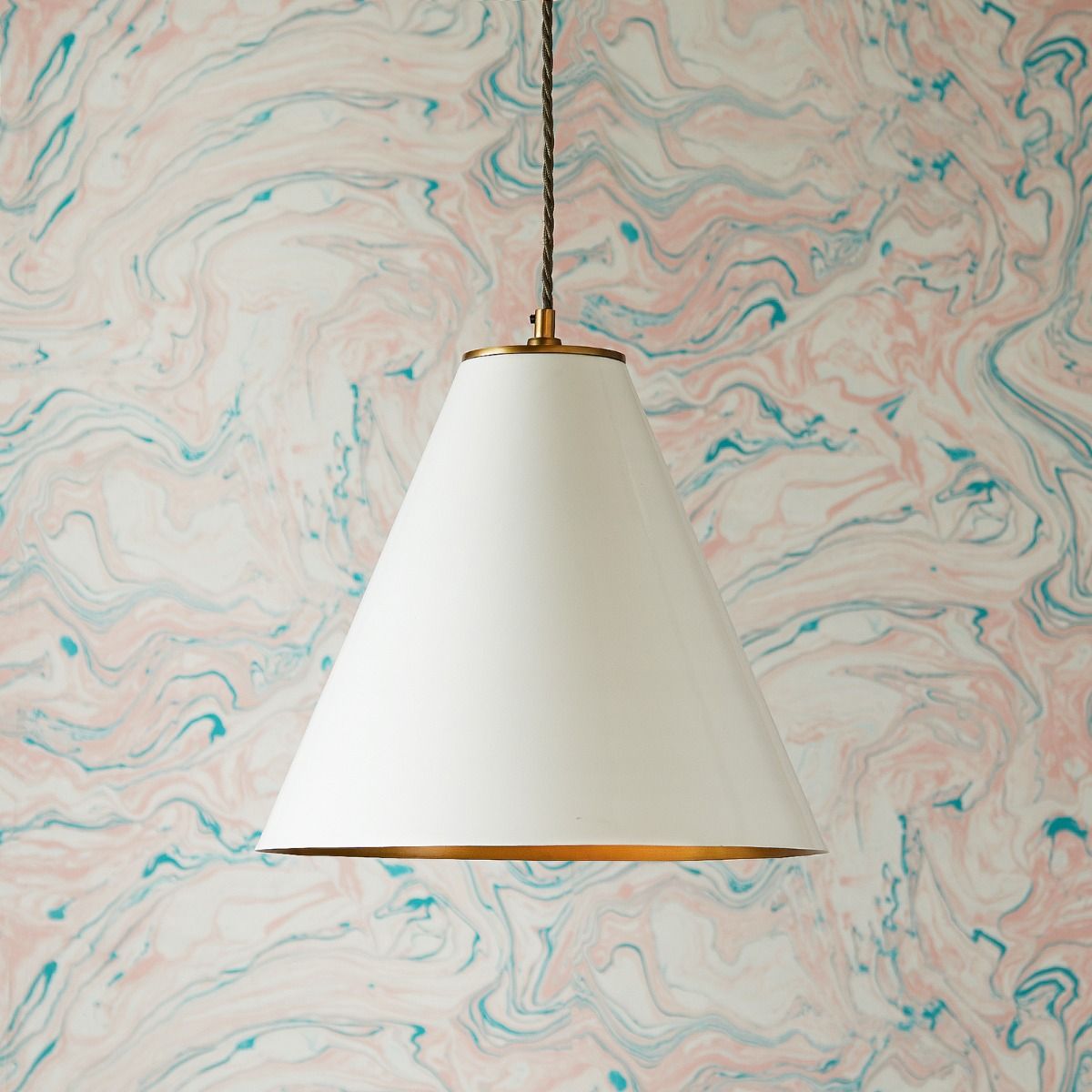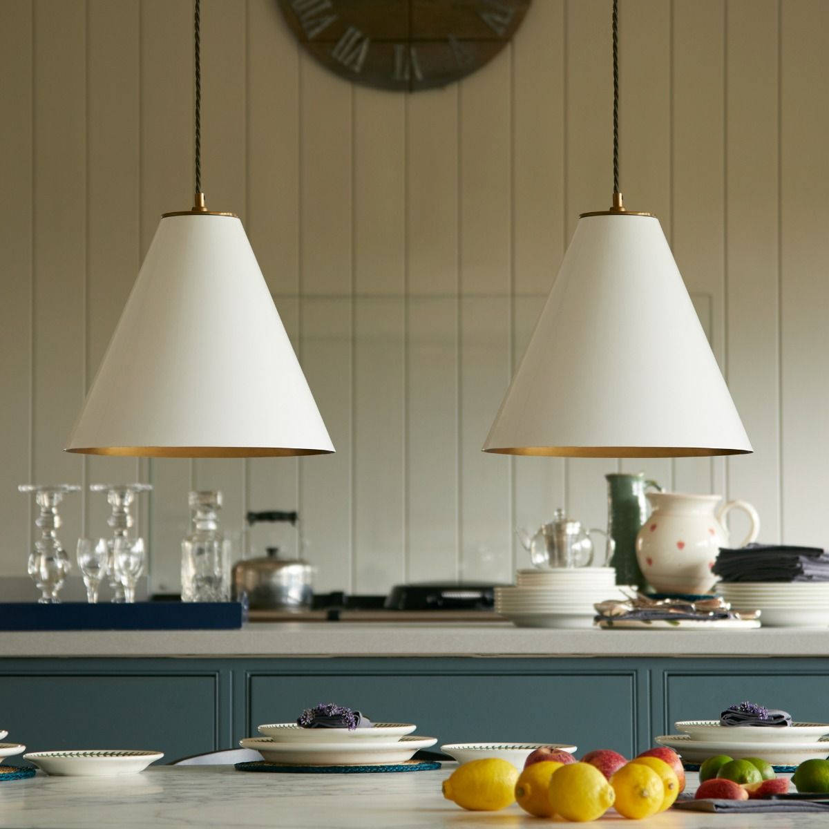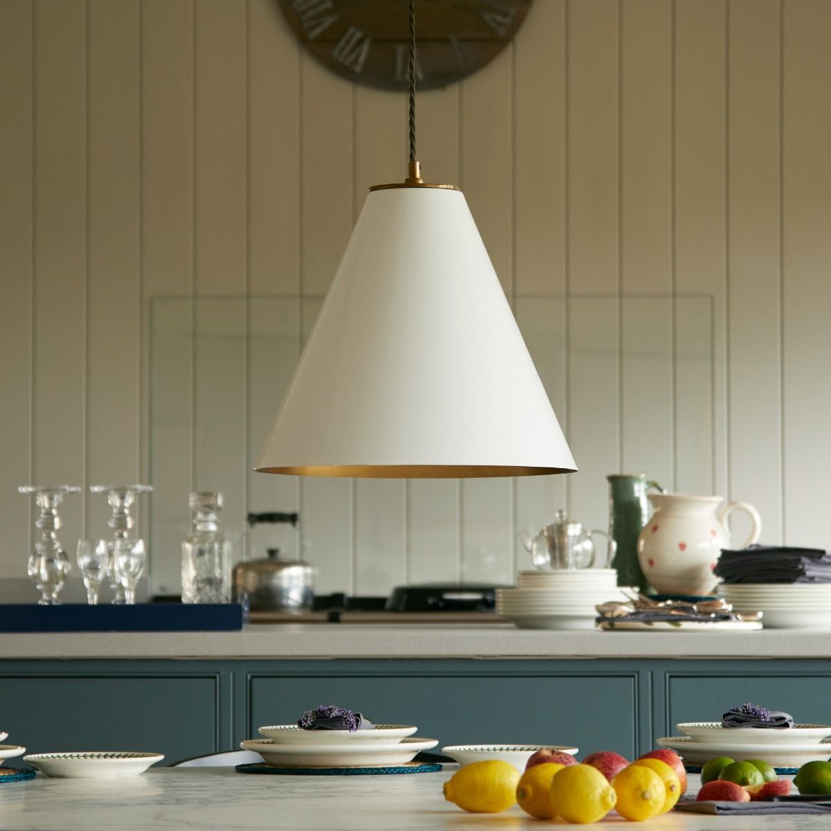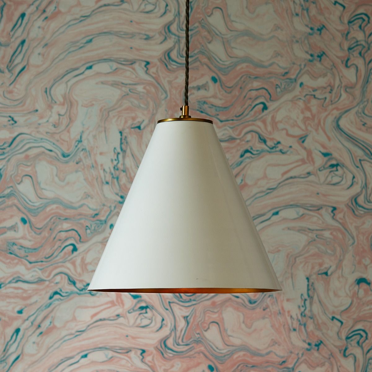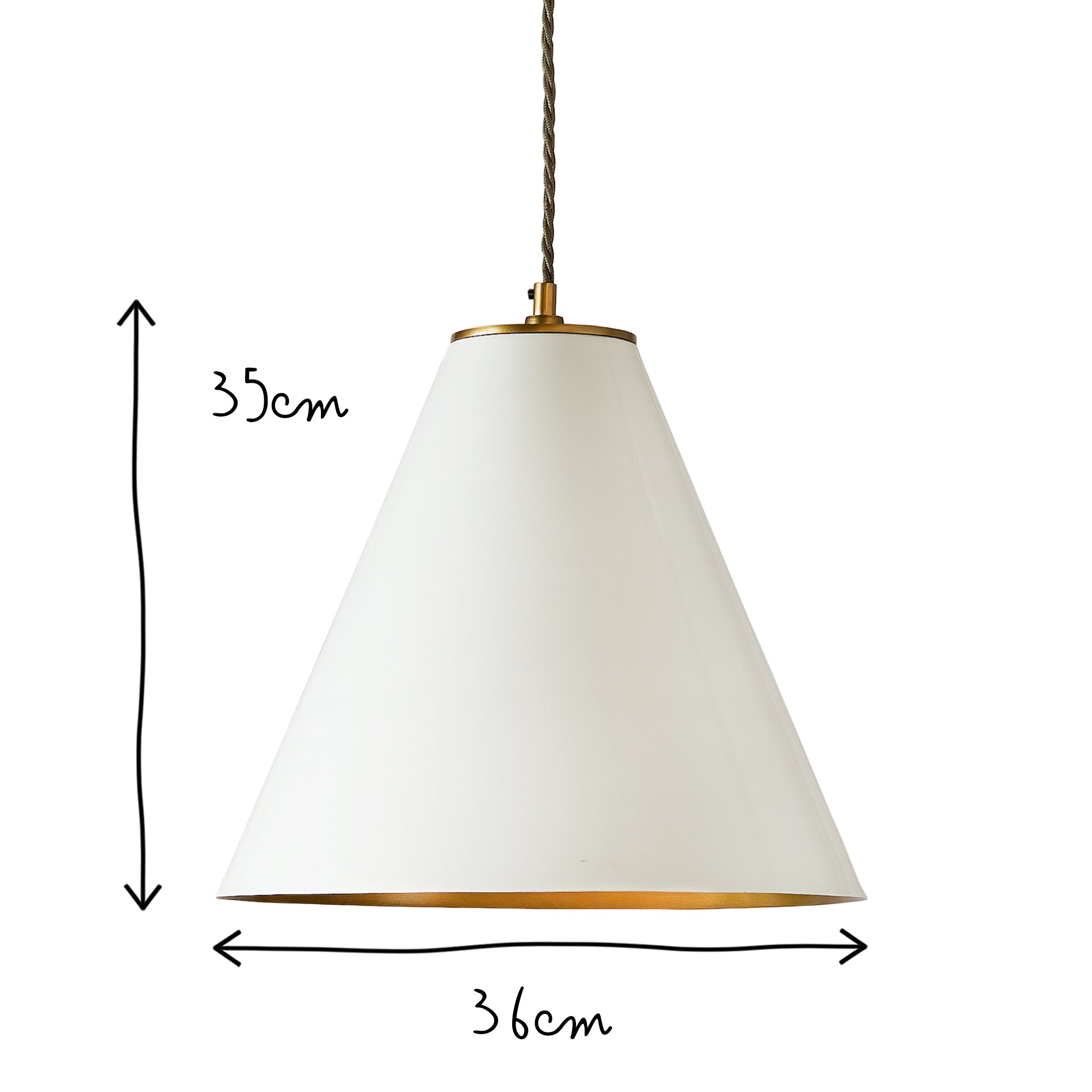 Our Super Stanley pendant lights are, as the name may suggest, simply super. Big, but not too big and a properly striking design. On the top of the cut off cone there is thick solid brass plate. The polished finish on the outside is slick and contemporary as hell, and the brass interior casts a lovely warm light. Available with either black or white exterior. A well thought out and serious light.