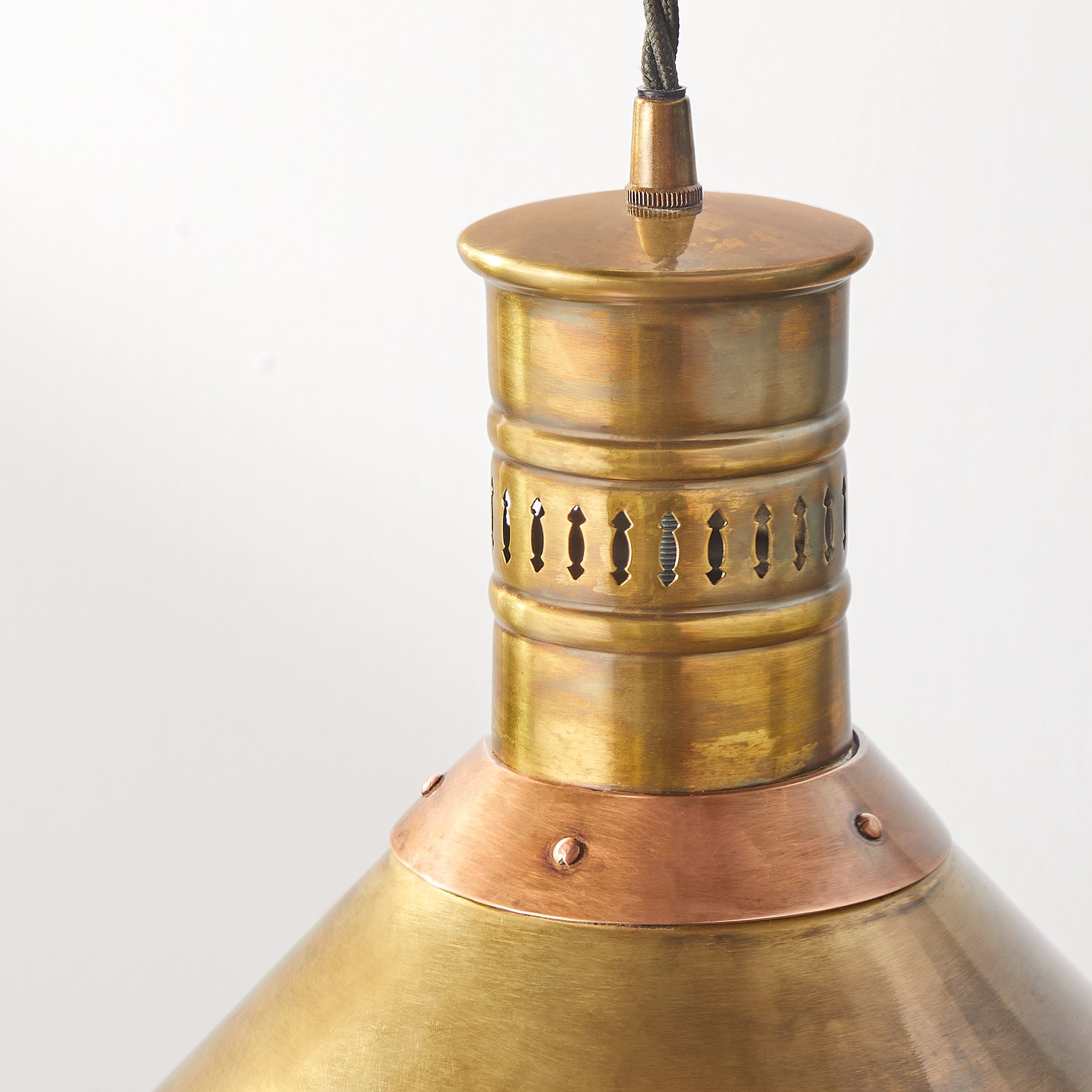 As artisans used to muse as they contemplated their foundries, "If you're looking for class then mix copper with brass". Well they may well have done because the two metals are most comely bedfellows. There's a lovely industrial vibe to this pendant which is then beautified by the mix of colours and delicate detailing.